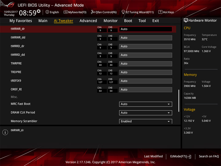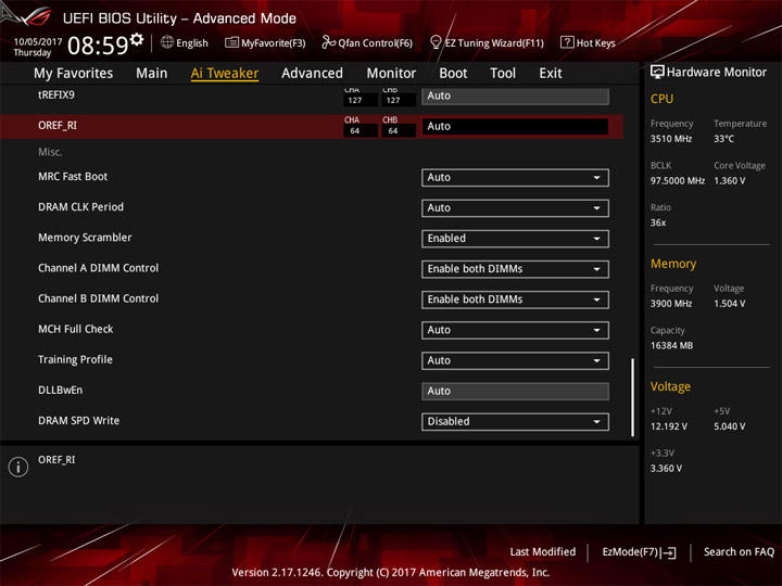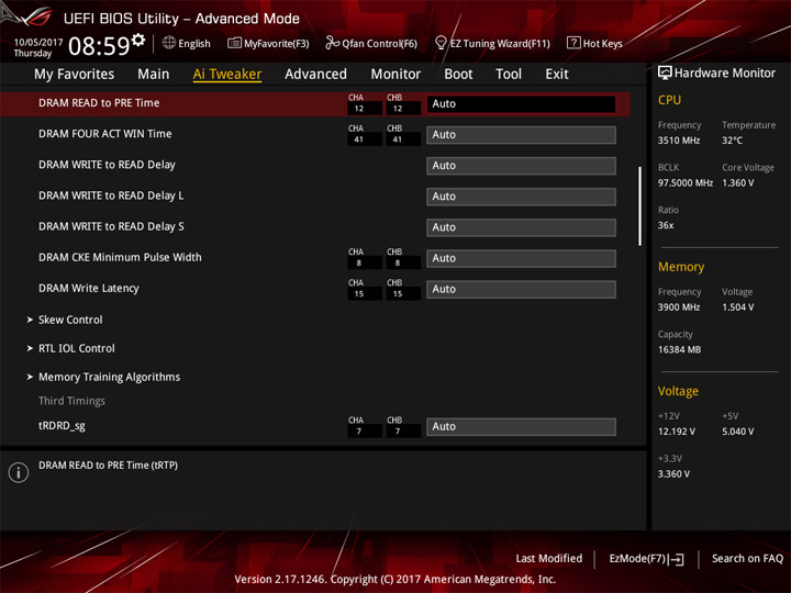 Стендовый комплект памяти представляет собой пару односторонних (1R) модулей с чипами ревизии B от Samsung (B-die). Она славится своими оверклокерскими возможностями. Не выходя за безопасные границы напряжений и лавируя между схемами задержек, получилось стабилизировать работу системы на частоте ОЗУ, равной 3900 МГц, при DRAM Voltage величиной 1,5 В. Конфигурация задержек имела вид 16-18-18-28-2T. Вспомогательные IO и SA выросли соответственно до 1,3 и 1,1 В.