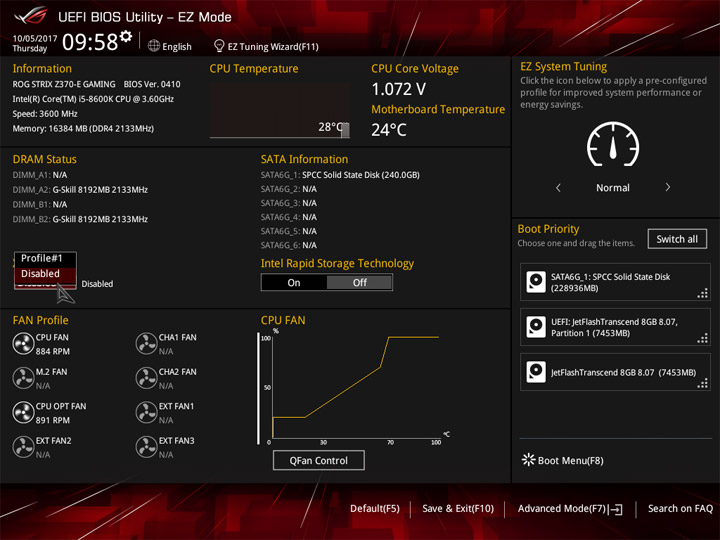 Обозреватели сведений о модулях памяти и графических устройствах — неизменные атрибуты игровых системных плат. Конечно, предусмотрены также и восемь профилей для хранения настроек системы.