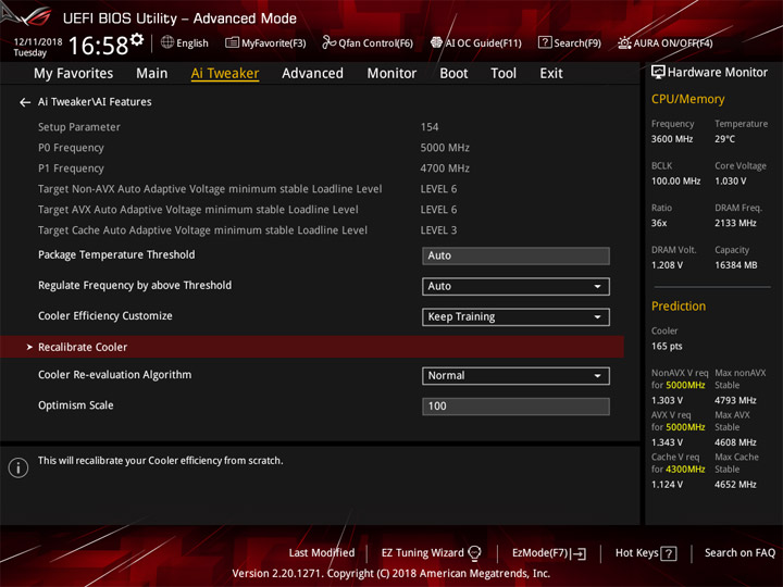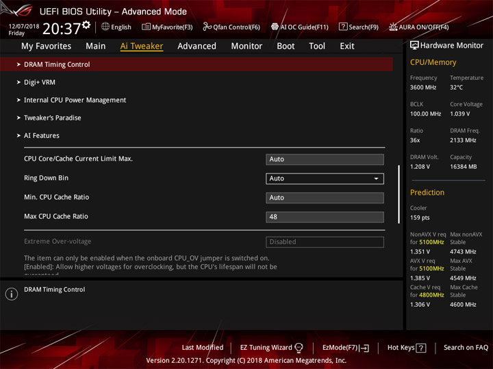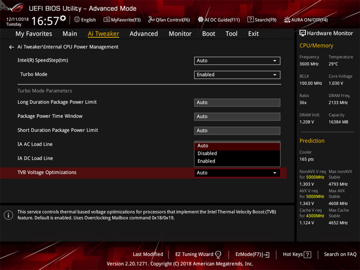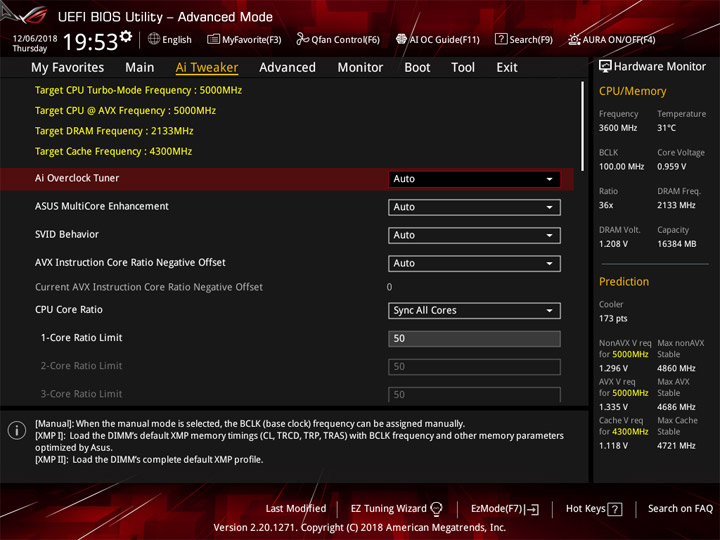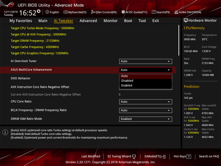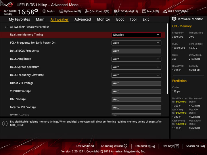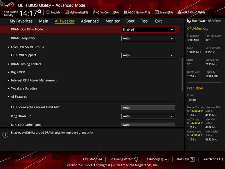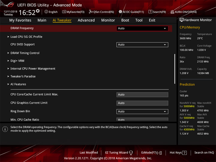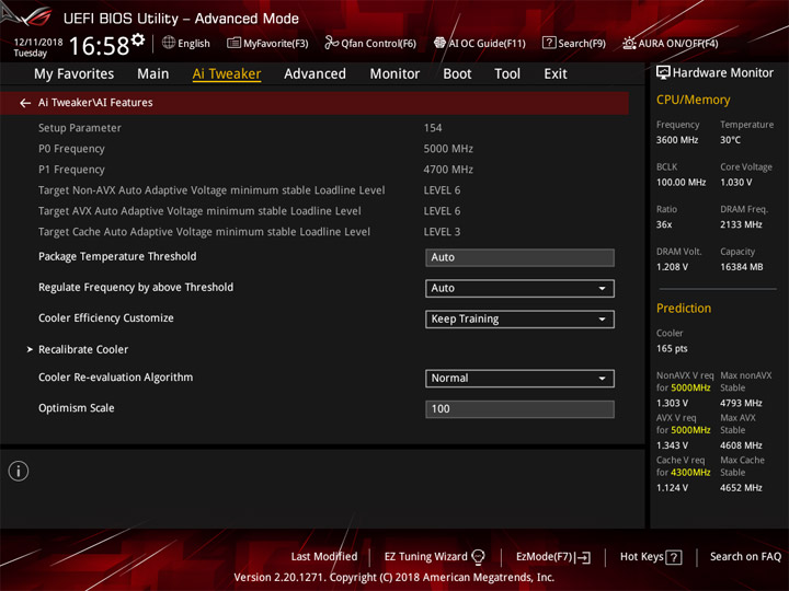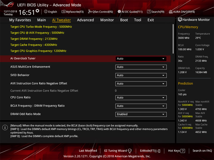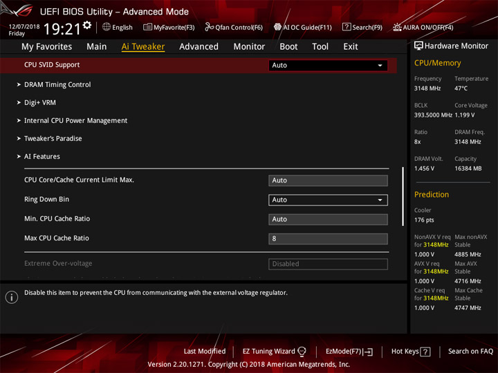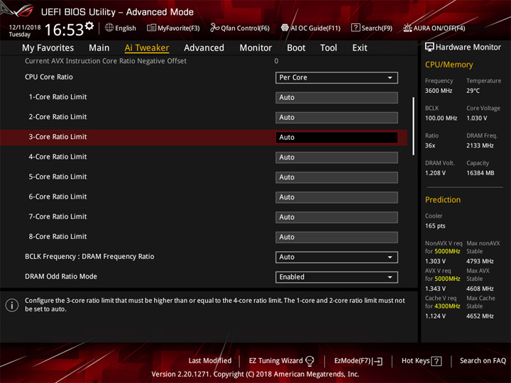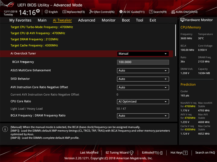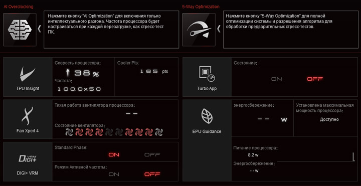 Структура и наполнение рубрики Ai Tweaker осталась прежней — здесь сконцентрированы механизмы под разгон системы. Обновился информационный уголок в правом нижнему углу экрана, там действующие напряжения сменились своеобразным паспортом для используемого ЦП и его кулера.