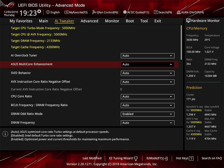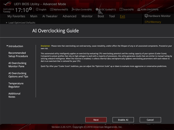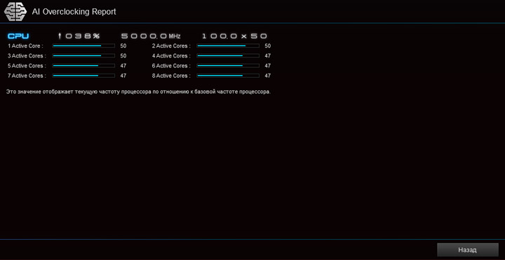 В завершении обзора я бы хотел остановиться на новом способе фирменного разгона «Ai». Активировать его можно как из UEFI, так и при содействии фирменного ПО. Лозунги обещают самообучение системы, но я же не увидел ничего нового. Фактически, Core i9-9900K продолжал функционировать со своими начальными параметрами, также никаких мер не было предпринято и для разгона ОЗУ.