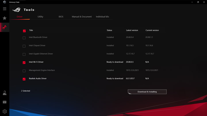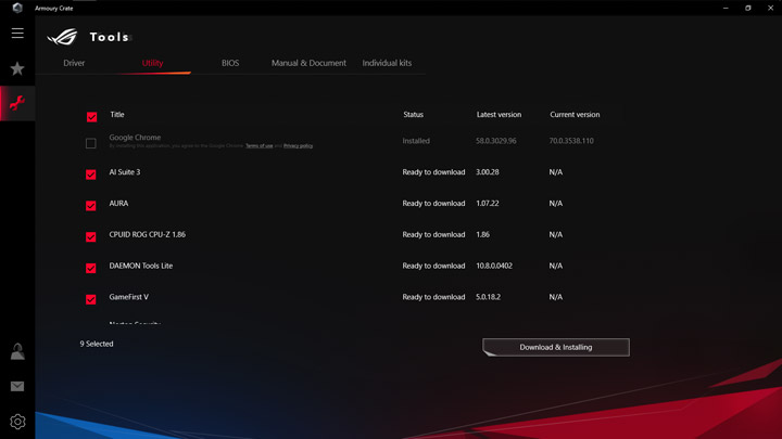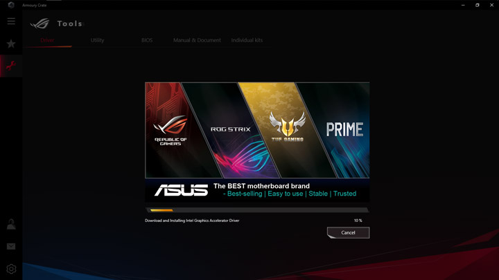 ASUS Grid Install Service, с которым мы знакомились в обзоре ROG Strix B450-I Gaming, сменил название, но суть осталась той же. Комплекс загружает оболочку, с разрешения пользователя, автоматически (в Windows 10), а там достаточно выбрать требуемые для инсталляции драйверы и фирменные утилиты.