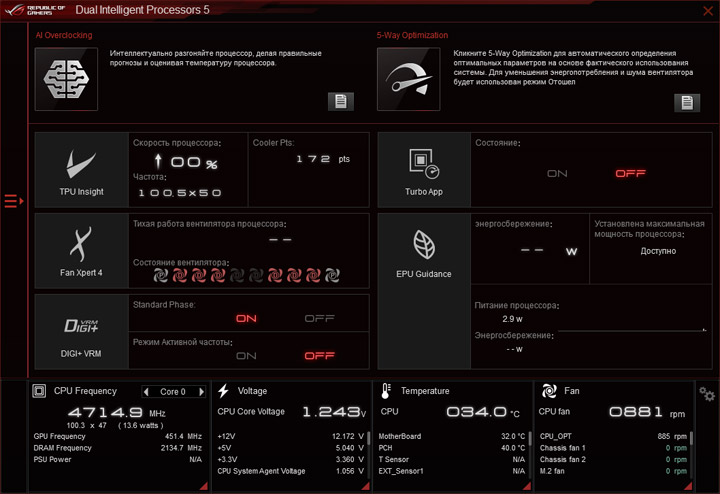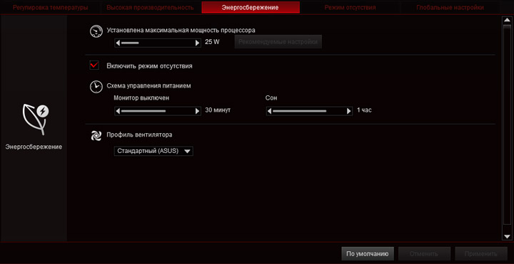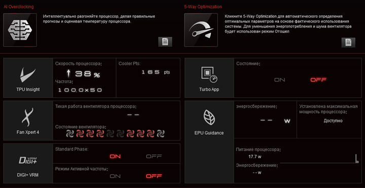 Скорее всего, механизм нуждается в доработке инженерами ASUS, требует большего участия в процессе пользователя, либо же фактически предназначен для менее мощных процессоров. На сегодняшний день я смысла в его использовании для себя не увидел. Единственным постоянно меняющимся параметром была величина «производительности» системы охлаждения, и для неё, скорее всего, заготовлена самая важная роль во всём происходящем.