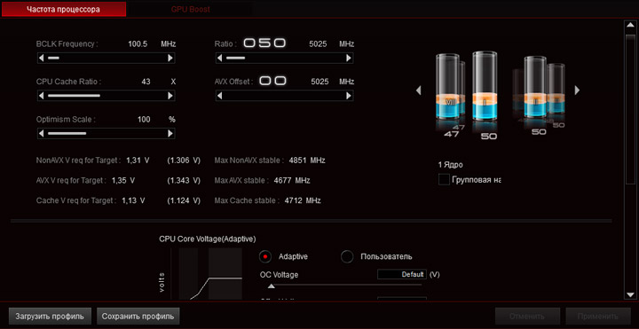 Собственные эксперименты я начал с разгона BCLK. Вышло зафиксировать стабильность в работе на уровне 393,5 МГц. Неприятно констатировать странное поведение устройства от ASUS, когда высокие параметры требовали обнуления настроек, отчего-то с прежними поколениями продуктов было достаточно подождать автоматического применения безопасных настроек для последующей корректировки уже выставленных переменных. Здесь же могут помочь профили с настройками, которые потребуется использовать в таких случаях.