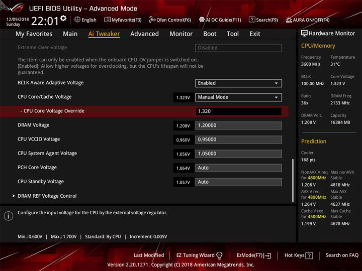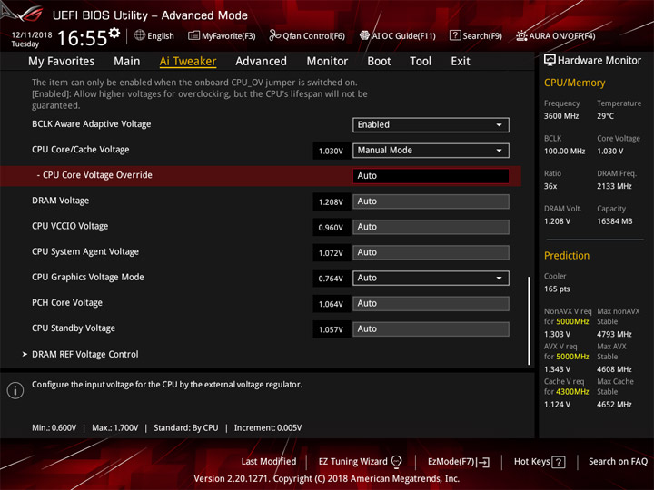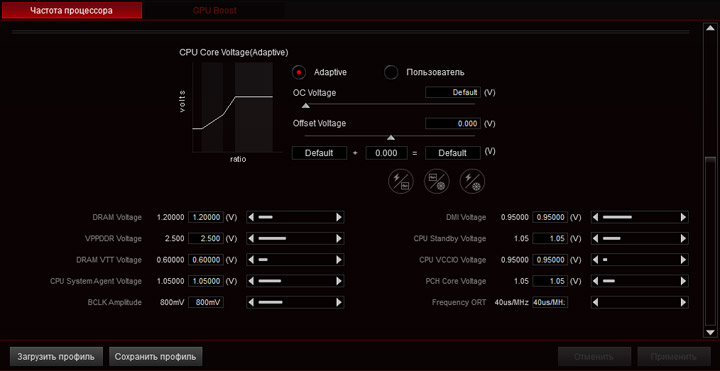 | CPU Core Voltage Override (В) | 0,6–1,7 | 0,005 |