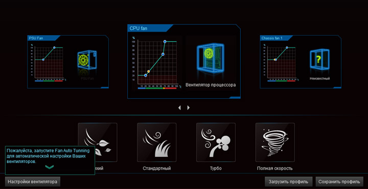 С базовыми настройками я не выделил никаких проблем в работе с тестовым ЦП. Однако для пользователей с начальными знаниями исчезли многочисленные наборы с готовыми преднастройками системы, вместо них теперь есть своеобразный интеллектуальный механизм, который не смог себя проявить с нашим CPU, оставив его штатную схему работы без изменений. Потому, для максимальной отдачи от системы, придётся запастись терпением и отладить её самостоятельно. В этом может помочь ещё входящий в комплект датчик температуры (выносной), его показатели можно вплести в алгоритмы по снижению оборотов охладителей.