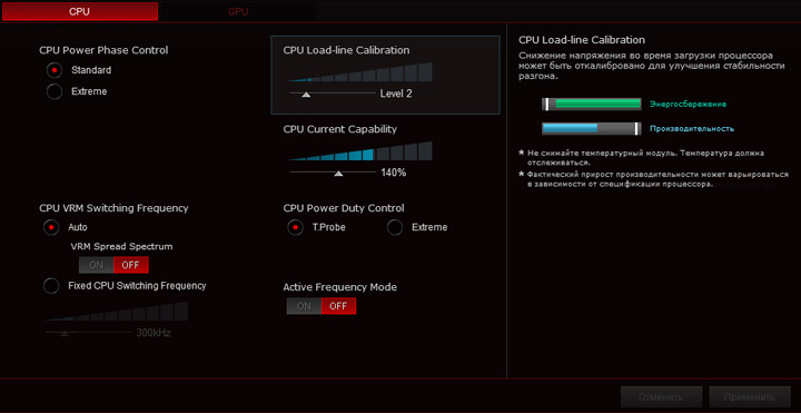 Существенно отличается наполнение рубрики DIGI+ VRM. Верхние пределы для множителей CPU и Cache выросли. Изменился подход к фирменному разгону от ASUS, теперь есть не список из готовых профилей, а отдельный механизм с собственным подменю, подразумевающий большую вовлеченность в процедуру подборки режима самим владельцем системы, но также не позабыт геймерский «однокликовый» профиль для оверклокинга ЦП.