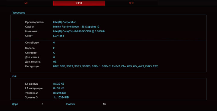 - процессор: Intel Core i9-9900K (3,6 ГГц);