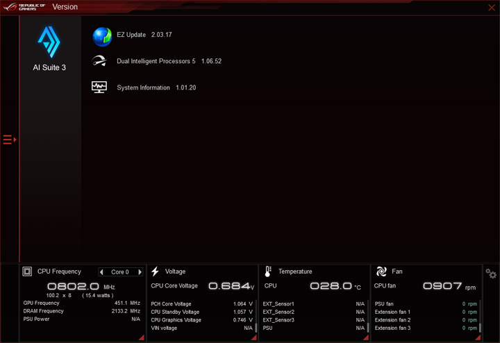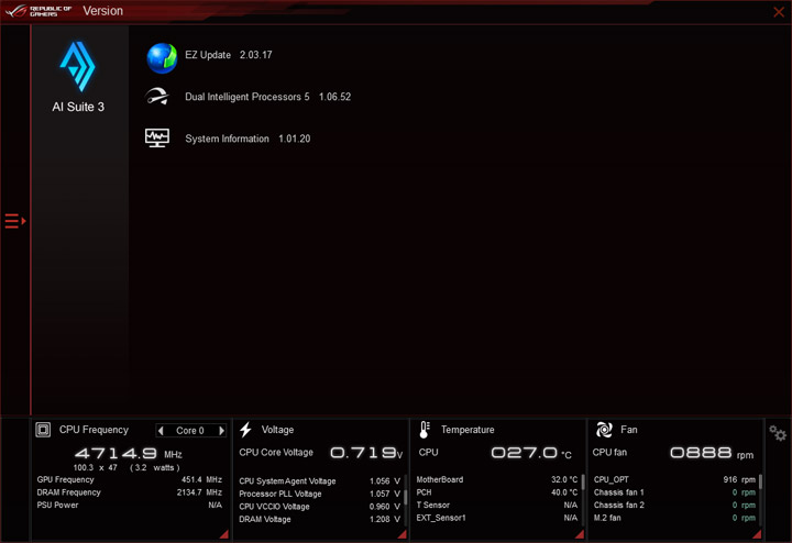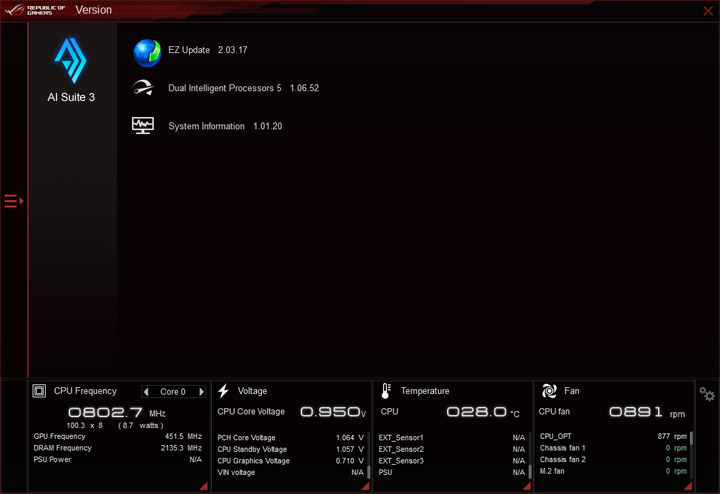 Суть, структура и наполнение комплекса фирменных программ от ASUS под именем Ai Suite не изменилась, но ряд изменений есть, для лучшего отделения обновлённых версий утилит их тоже оснастили слегка модифицированными названиями.