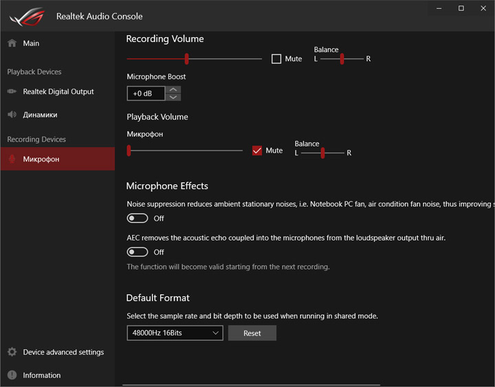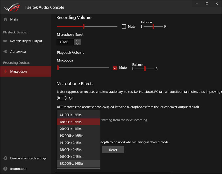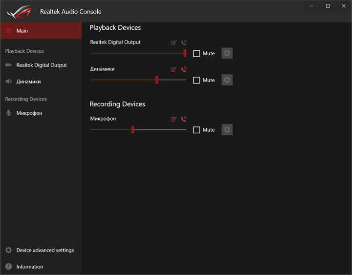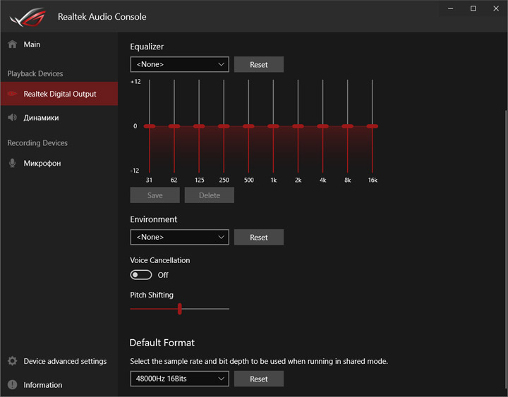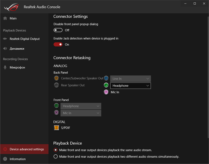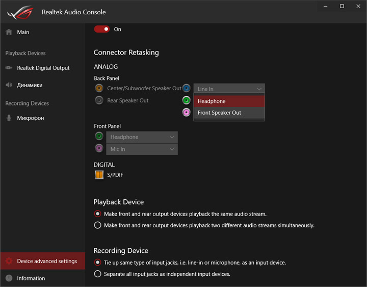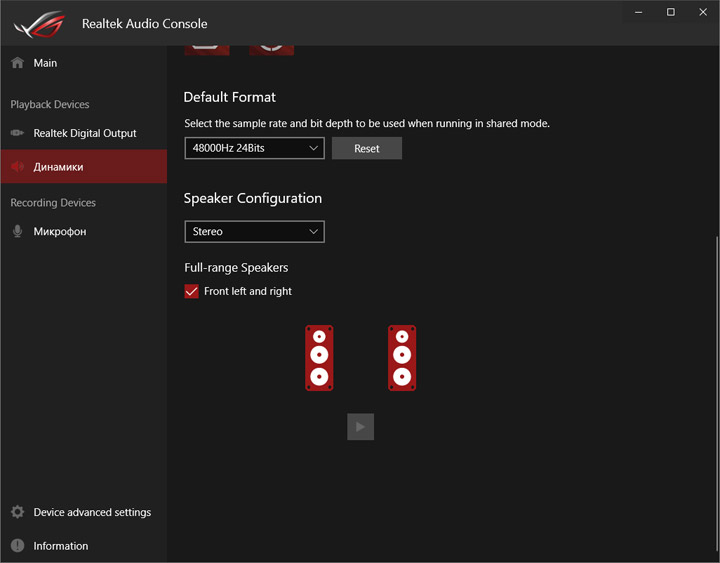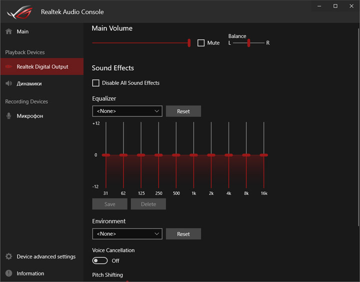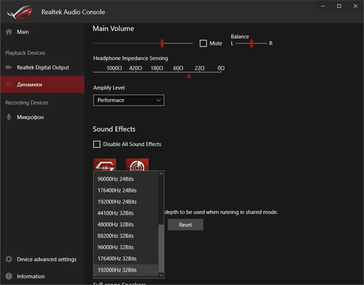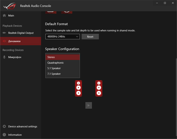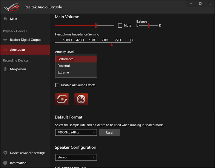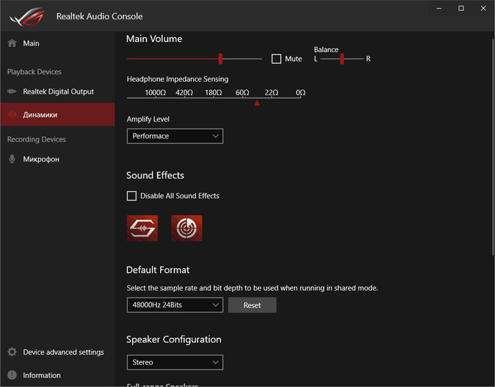 Конфигуратор Realtek для наладки схемы работы звукового оборудования оснащён специализированным оформлением от ASUS. Допускается выбрать тип подключенного оборудования (к гнезду на задней панели), но изменений в звучании при этом я не ощутил. Также в наличии три профиля предусиления выходного сигнала, они ощутимо влияют на уровень выходного сигнала. Подачу материала можно охарактеризовать как выполненную с акцентом на СЧ, вокал и гитарные партии явно превалируют, в диапазоне ВЧ нет явных проблем с достоверностью и точностью расположения источника звука, но его характер не выглядит живым, естественным. С НЧ всё ещё печальнее — мидбас надут и одновременно обрывист, словом, погружения в атмосферу прослушиваемого материала нет, словно аналитичность сцены была во главе идеи построения всего комплекса звучания.