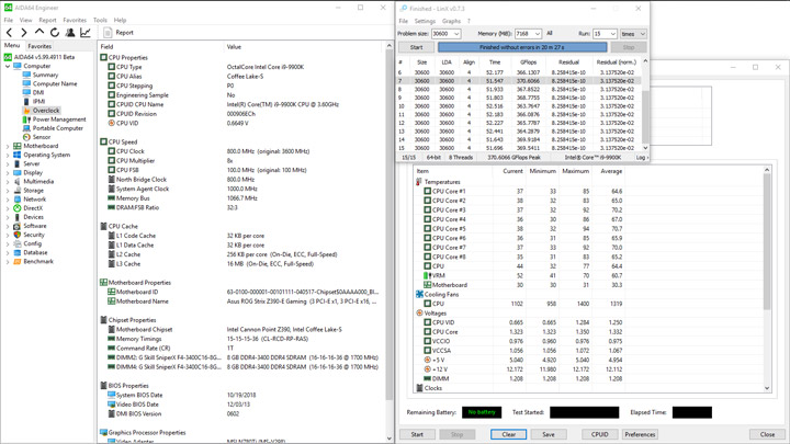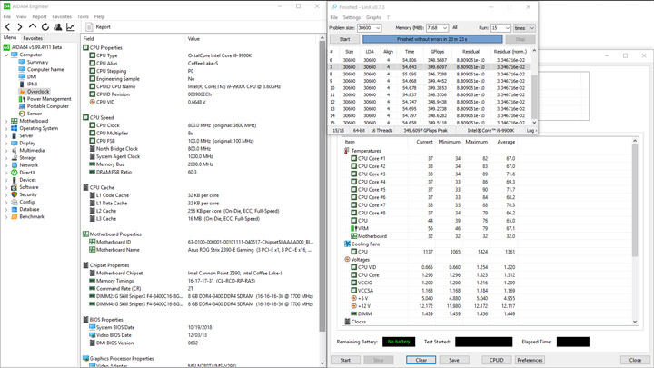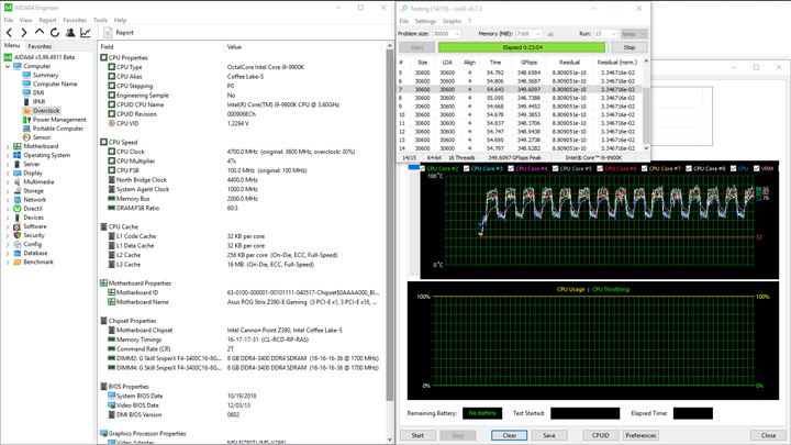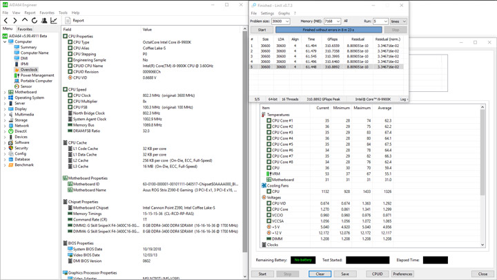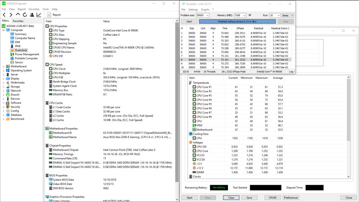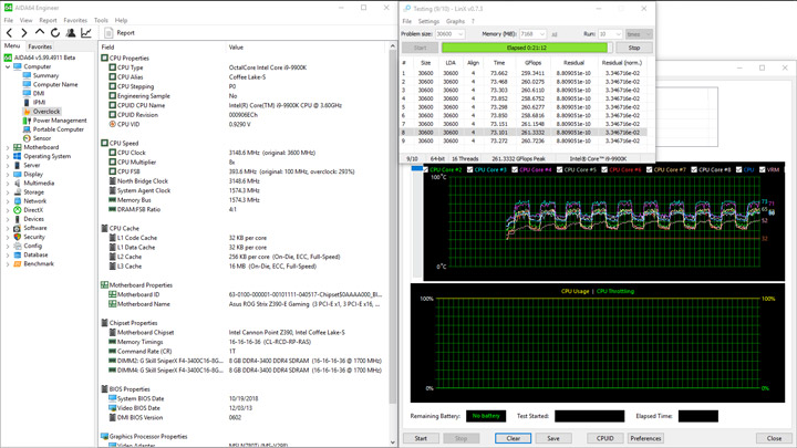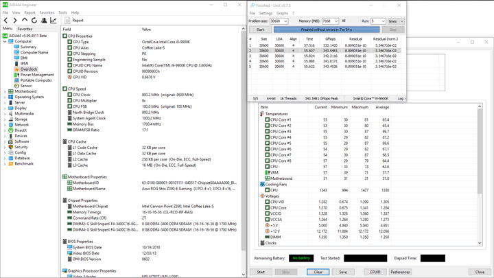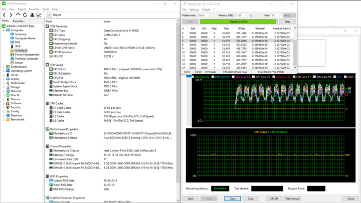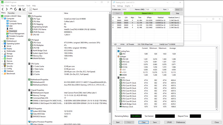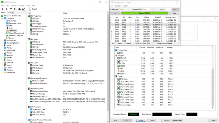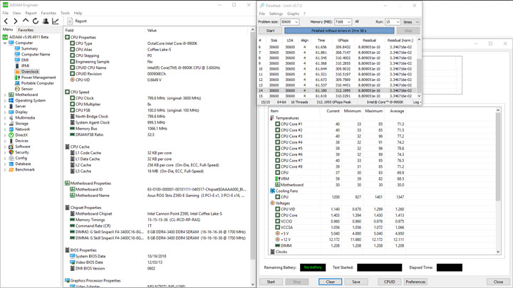 Не слишком высокая частота у ядер принесла больше плодов в виде лучшей производительности системы, замеряемой LinX в виде ГФлопс. Установки в UEFI позволили напряжению ЦП не выйти за границы 1,394–1,43 В, а средней отметкой стали 1,413 В.