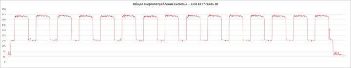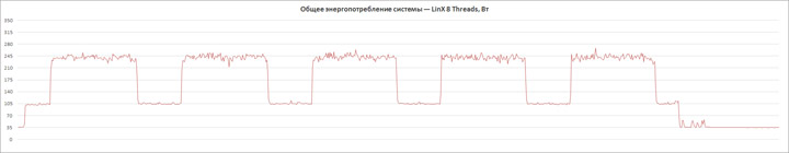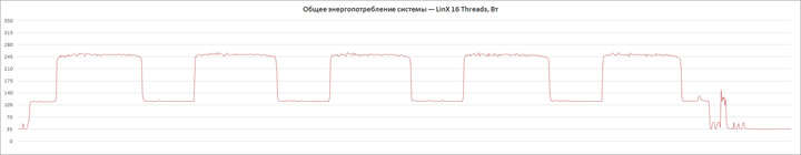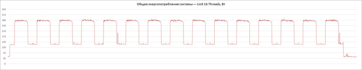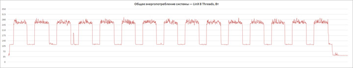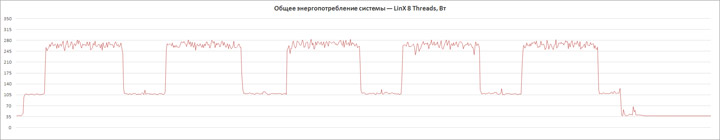 И вновь лучший результат в LinX был при активных восьми потоках, оттого нагрузка на систему в этом случае также стала выше, новые переделы по энергопотреблению стенда — 37–278 и 37–284 ватт.
