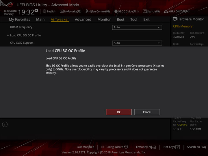 Упрощённый разгон системы сводится к активации профиля UEFI «5G OC». Помимо очевидного увеличения множителя (для всех ядер) и новой отметки для LLC, выделить в UEFI особо нечего.