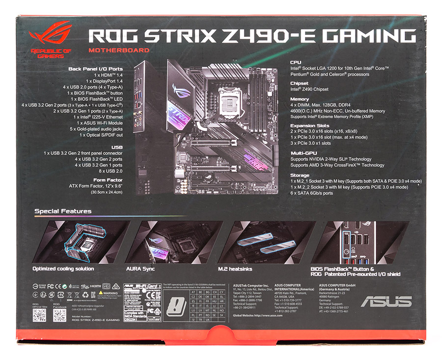 Плата поставляется в темной коробке с оформлением один в один похожим на аналогичное у ROG Strix Z390-E Gaming, лишь фотография изделия поменялась и значки внизу на лицевой панели. Даже дизайн обратной стороны особо не перерабатывался, лишь сместились акценты на пару поддерживаемых особенностей продукта.