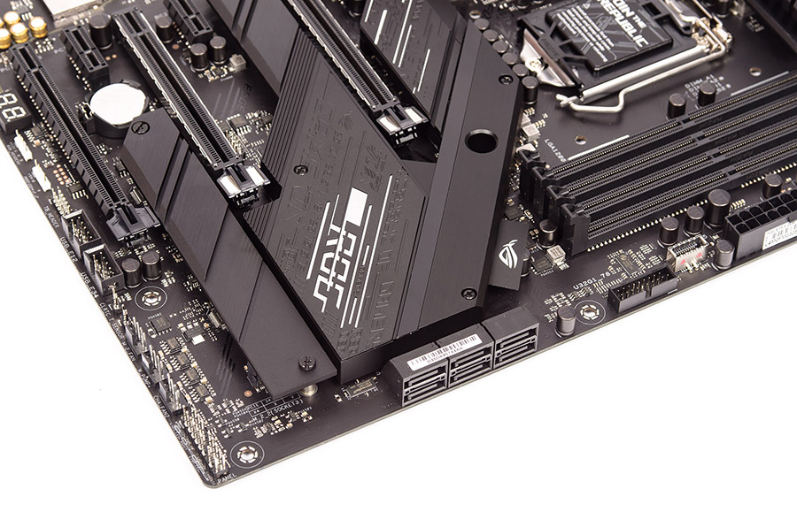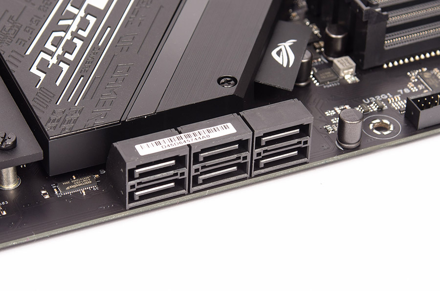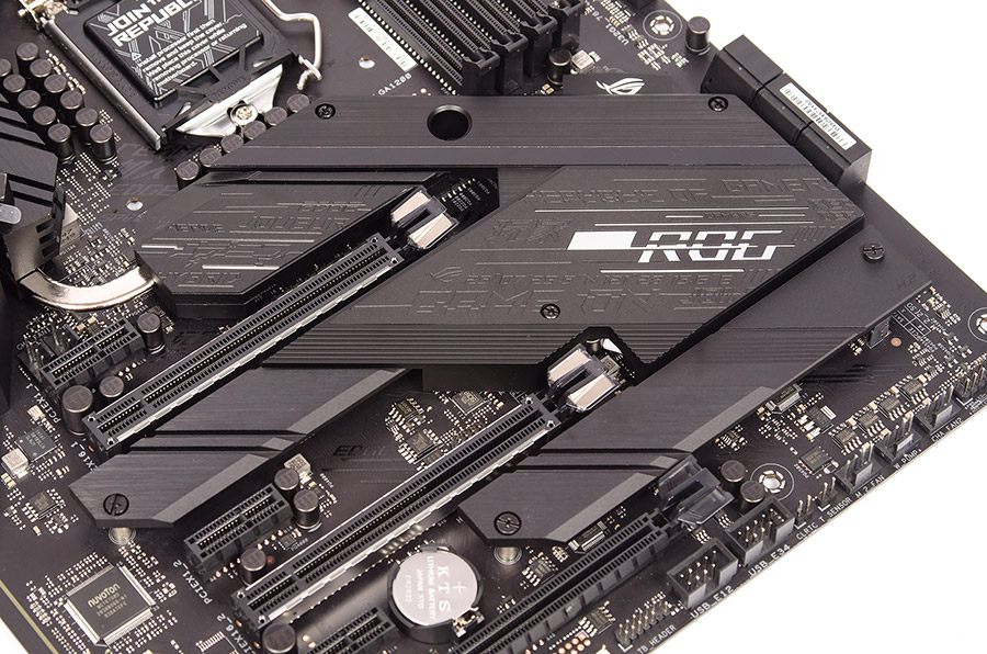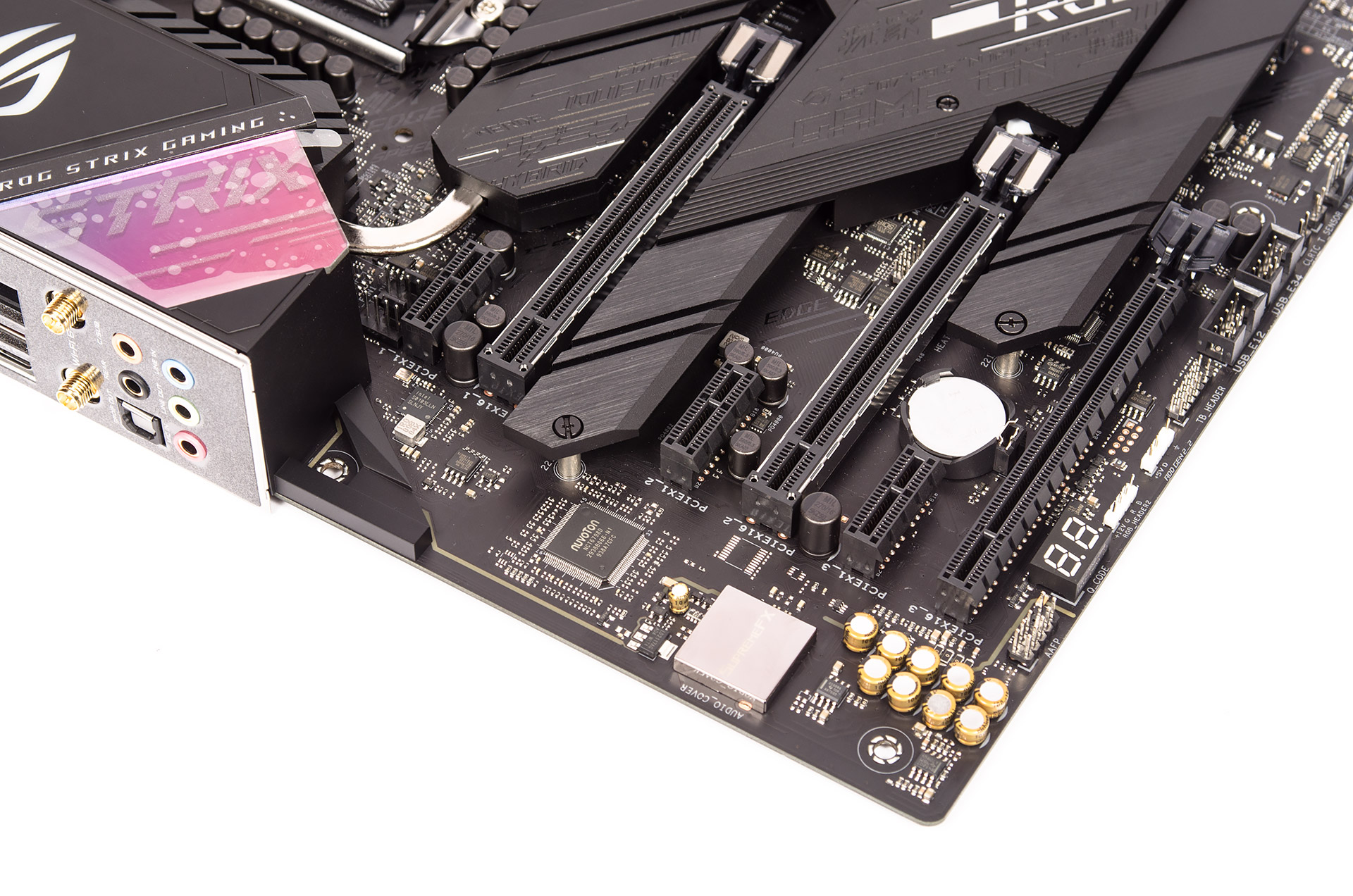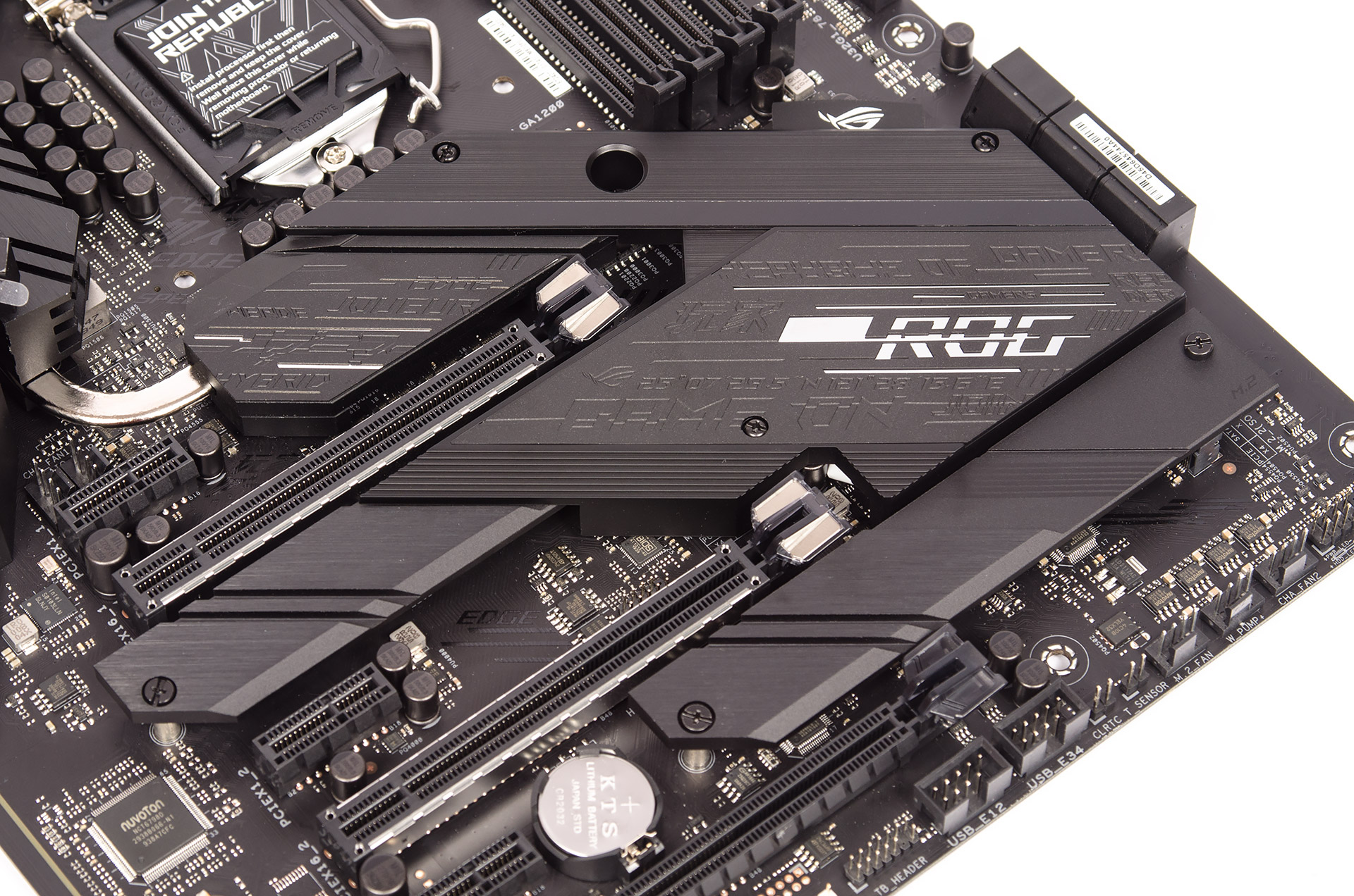 Как и подобает игровым продуктам ROG Strix Z490-E Gaming оснащена тремя слотами PCI Express x16, два из которых усилены металлическим экраном и подключены к процессору, а третий, работающий в режиме х4, уже к чипсету. Есть еще три PCI-E x1, чего с головой хватит для различных карт расширения.