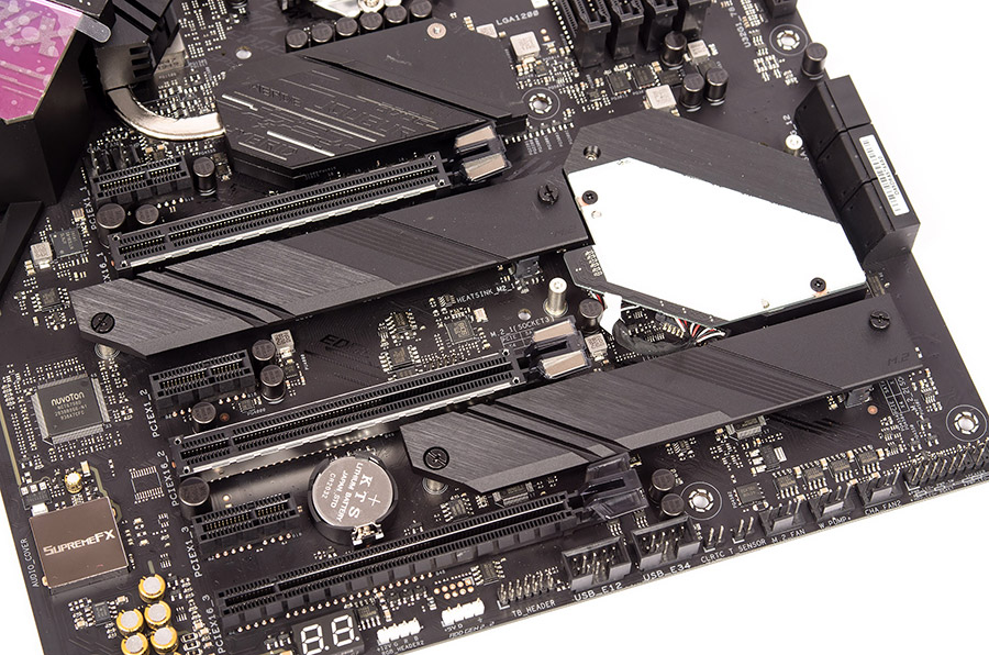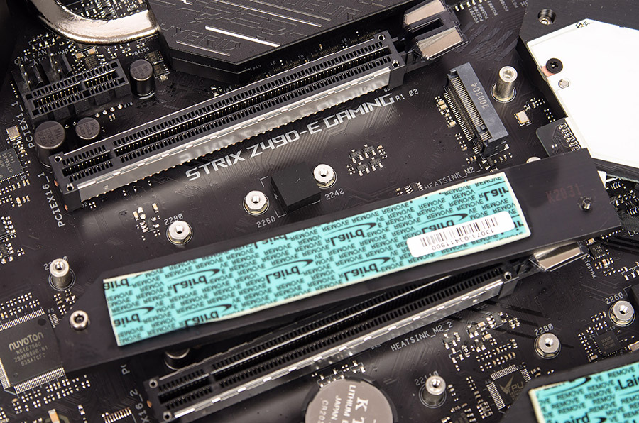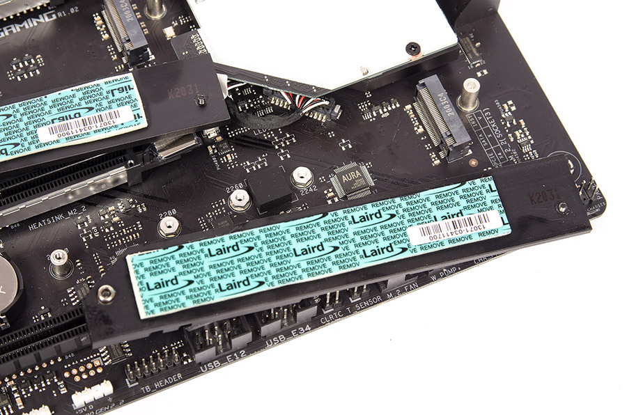 Два разъема М.2 позволяют установить NVMe-накопители с максимальным типоразмером 22100 каждый и оснащены продолговатыми алюминиевыми накладками-радиаторами с предустановленными термопрокладками.