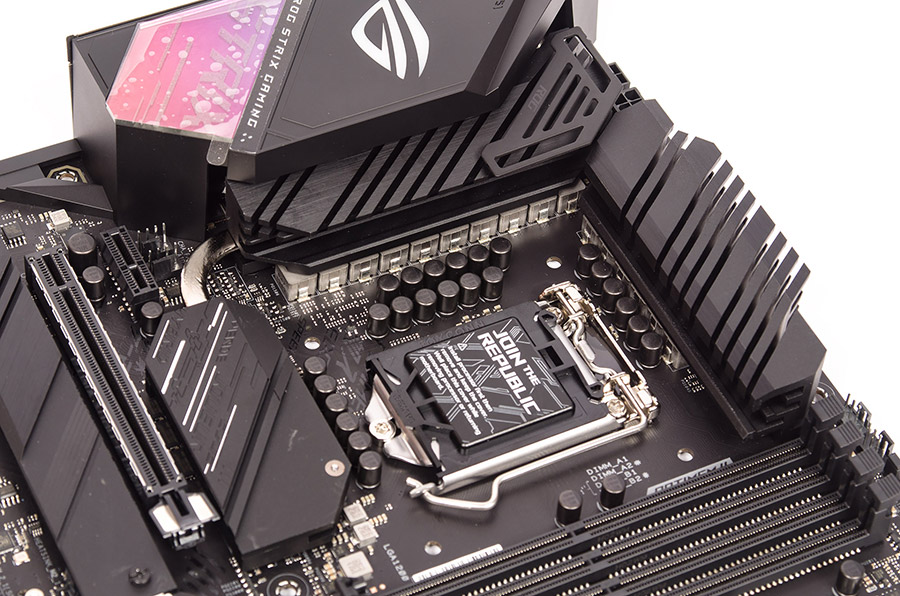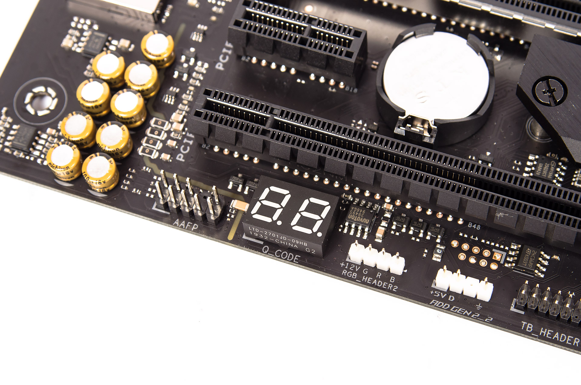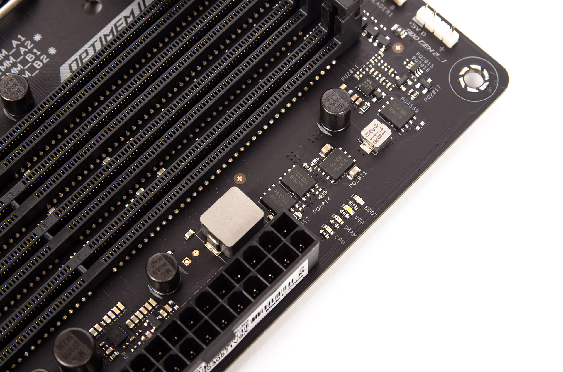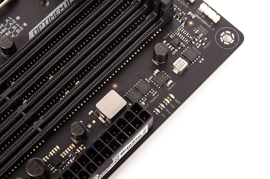 Но если этот индикатор не видно более чем полностью, то группу светодиодов диагностики системы Q-LED не заметить будет сложно, благо она расположена сверху платы возле разъема питания. Ну и все, никаких тебе больше кнопок, переключателей и прочего, которые можно было встретить на старых продуктах ROG Strix. Исчез даже разъем Node, рассчитанный на подключение сторонних панелей или блоков питания с возможностью мониторинга параметров.