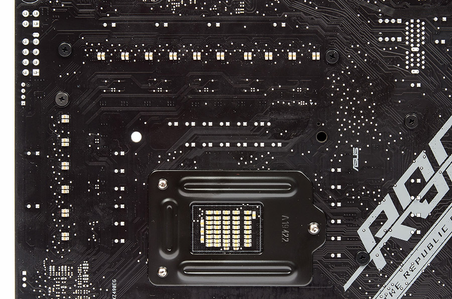 Радиатор для чипсета Z490 представляет собой семиугольный плоский брусок, подогреваемый сверху светодиодной панелью RGB-подсветки. К счастью, потребляемая мощность хаба небольшая, так что, накрытый сверху пластиком чип вряд ли перегреется.