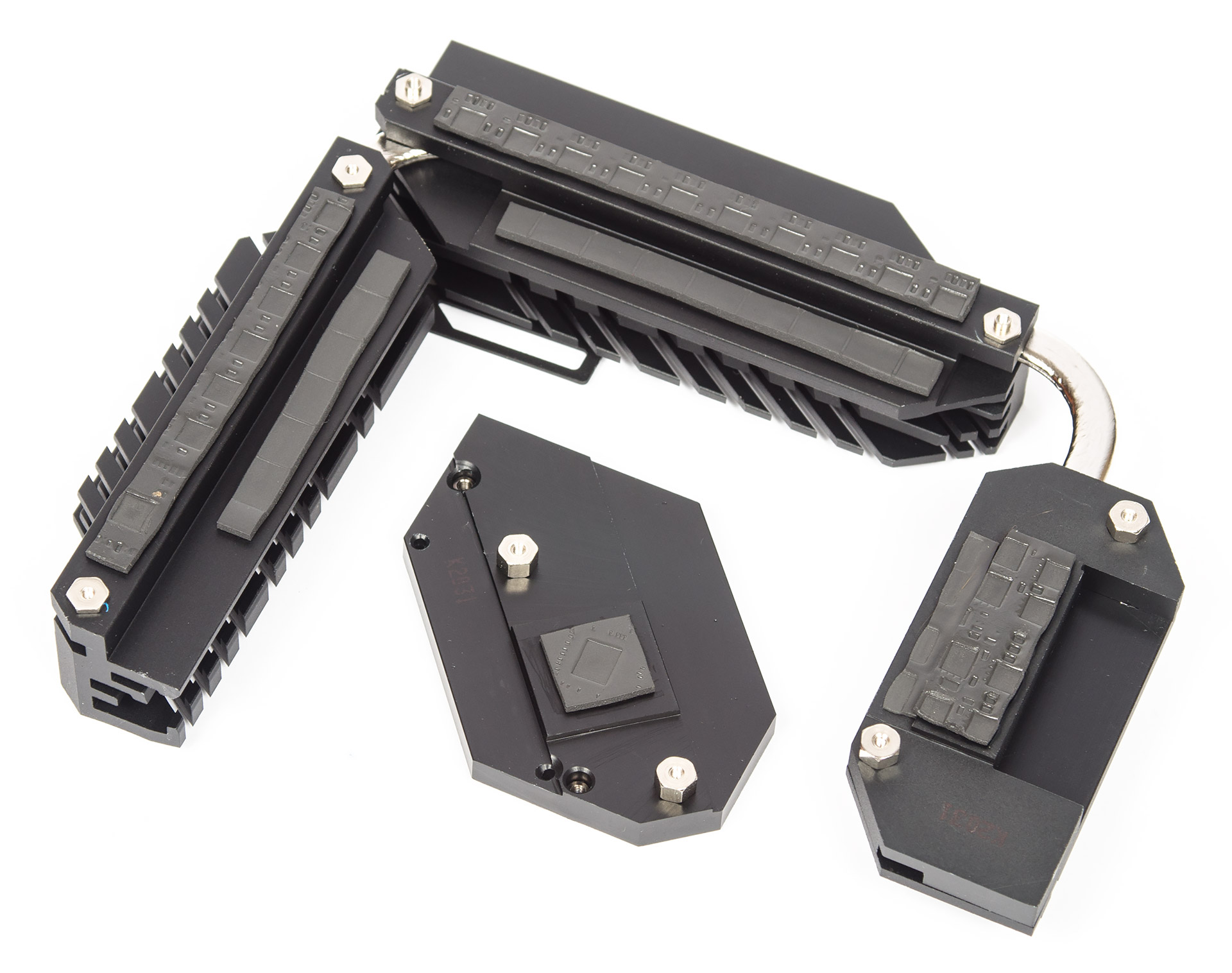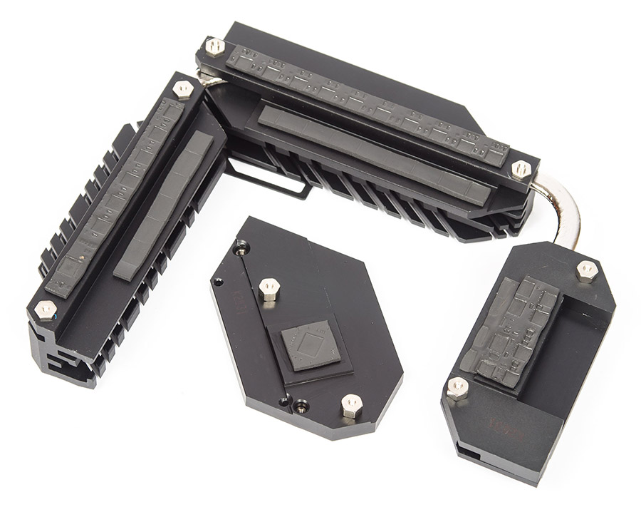Тепло от силовых элементов к радиаторам, соединенных тепловой трубкой, передается при помощи толстых термопрокладок. Для чипсета используется аналогичный материал.