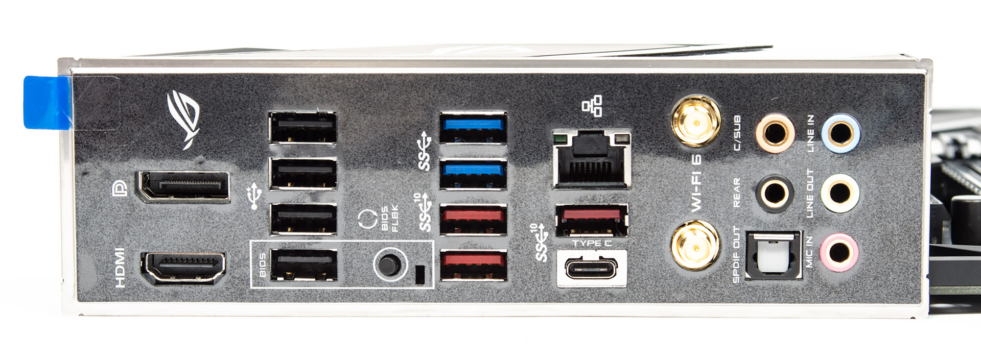 На задней панели мы обнаружим DisplayPort и HDMI, четыре USB 2.0, один из которых может использоваться для обновления прошивки при помощи технологии FlashBack, соответствующая кнопка BIOS FLBK, два USB 3.2 Gen1, три USB 3.2 Gen2 и USB 3.2 Gen2 Type-C, сетевой разъем 2,5G, два коннектора для выносной антенны WiFi и аудиопорты.