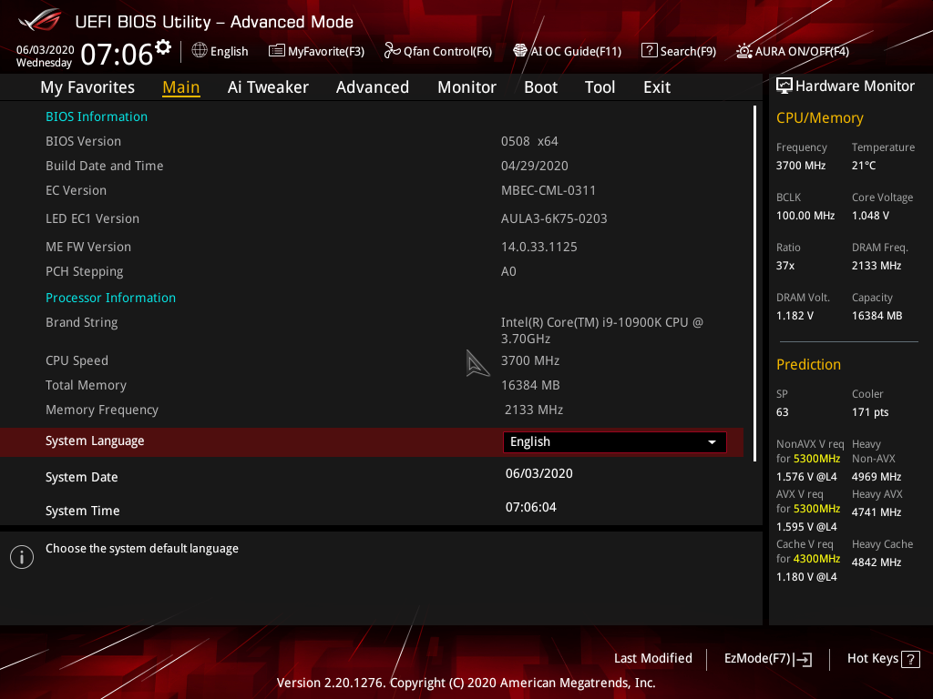 Если сравнить новинку с продуктом на чипсете Z390, то интерфейс практически оставили без изменений, лишь цвет названия подразделов меню Main сменили с желтого на зеленый. Плата использовалась с последней прошивкой версии 0508 и обновлять ее не пришлось.