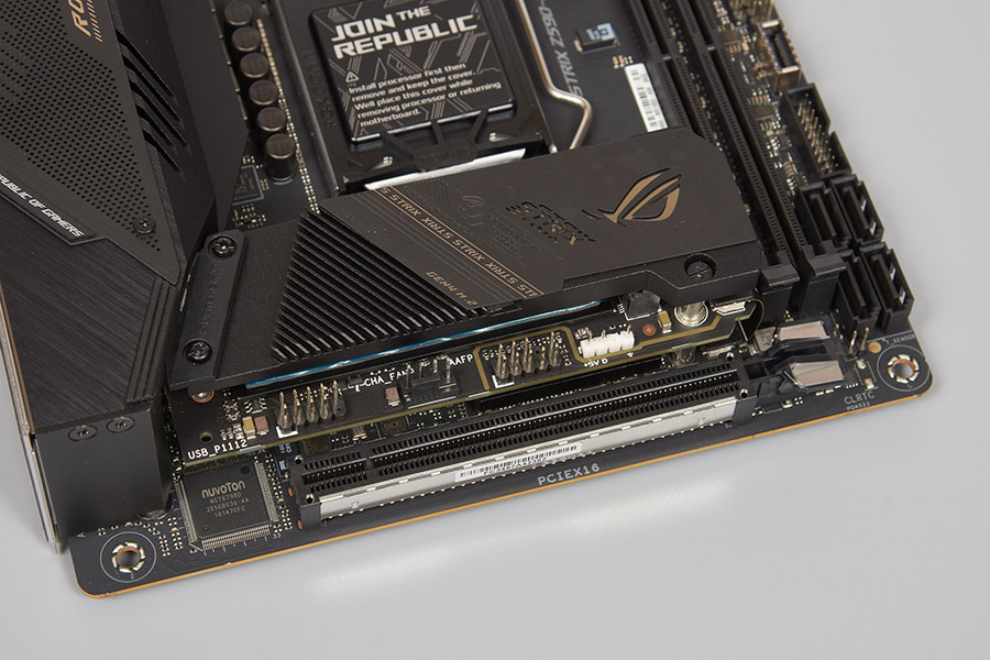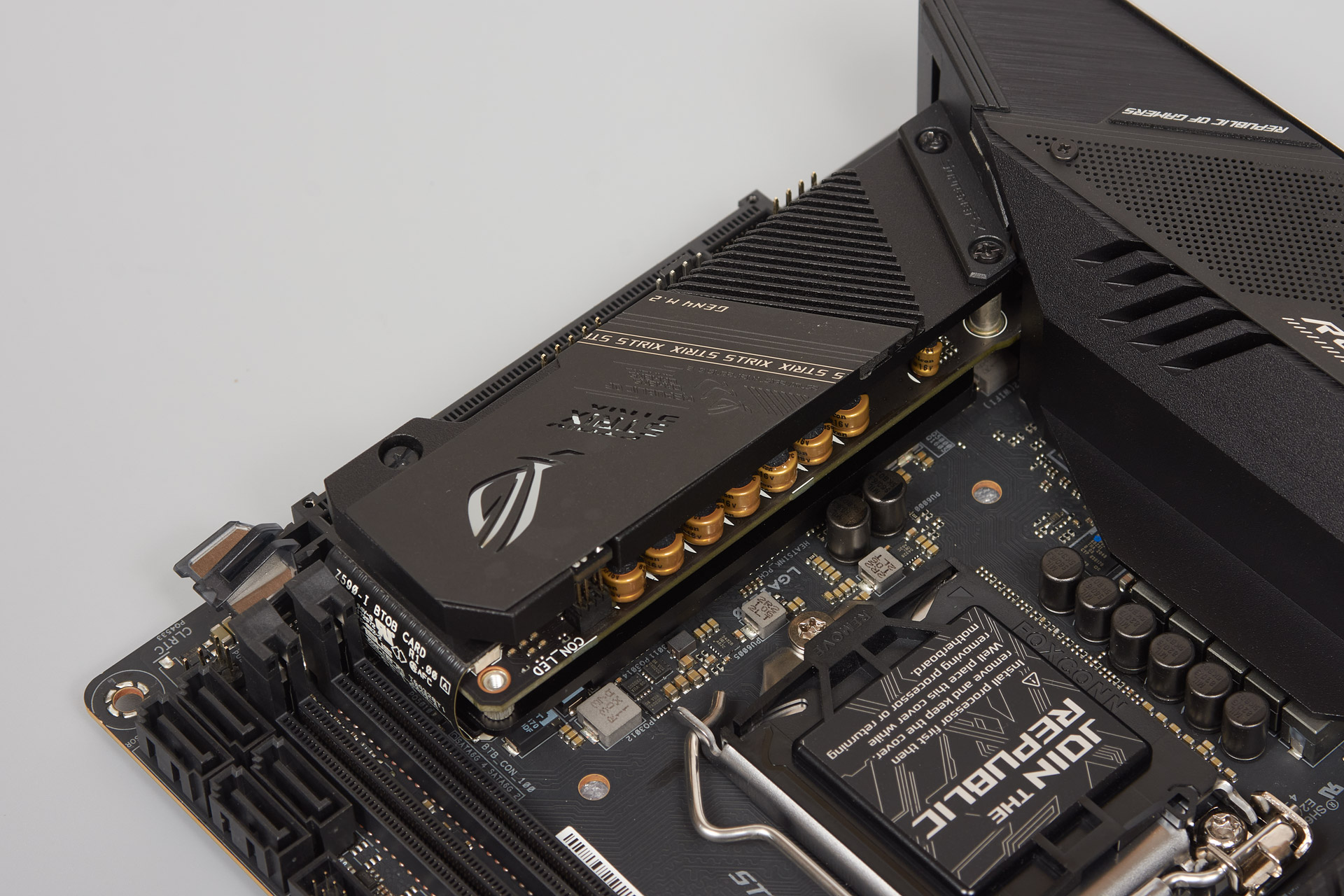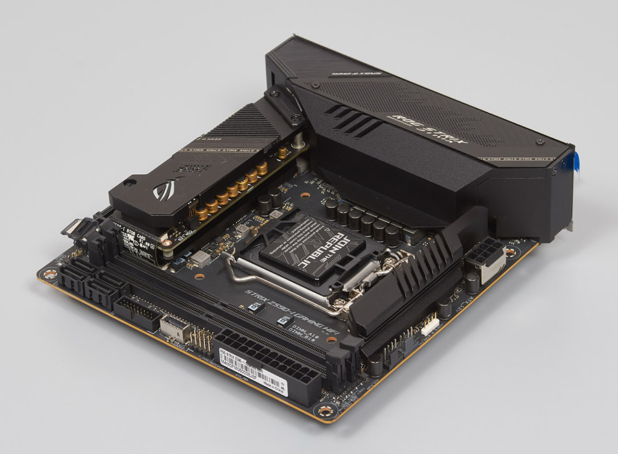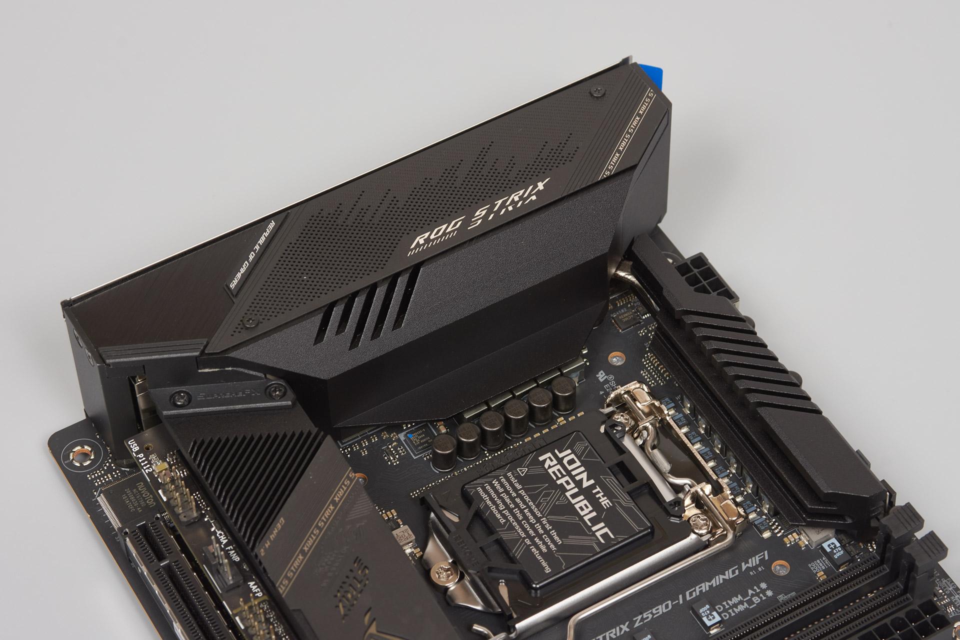 Интерес к сборке компактных систем из года в год не сбавляет обороты. Помышляя о платформе с включением процессоров Rocket Lake-S, необходимо учитывать их горячий нрав и подбирать материнскую плату, которая с ними сможет совладать. Сегодня мы познакомимся с представителем игровой серии ROG Strix, старшей у ASUS, а значит дополнений, бонусов и необычных ходов тут должно быть много. Сразу можно разглядеть, что это уже не просто плата в типичном понимании — тут спроектирован фактически «сэндвич».
