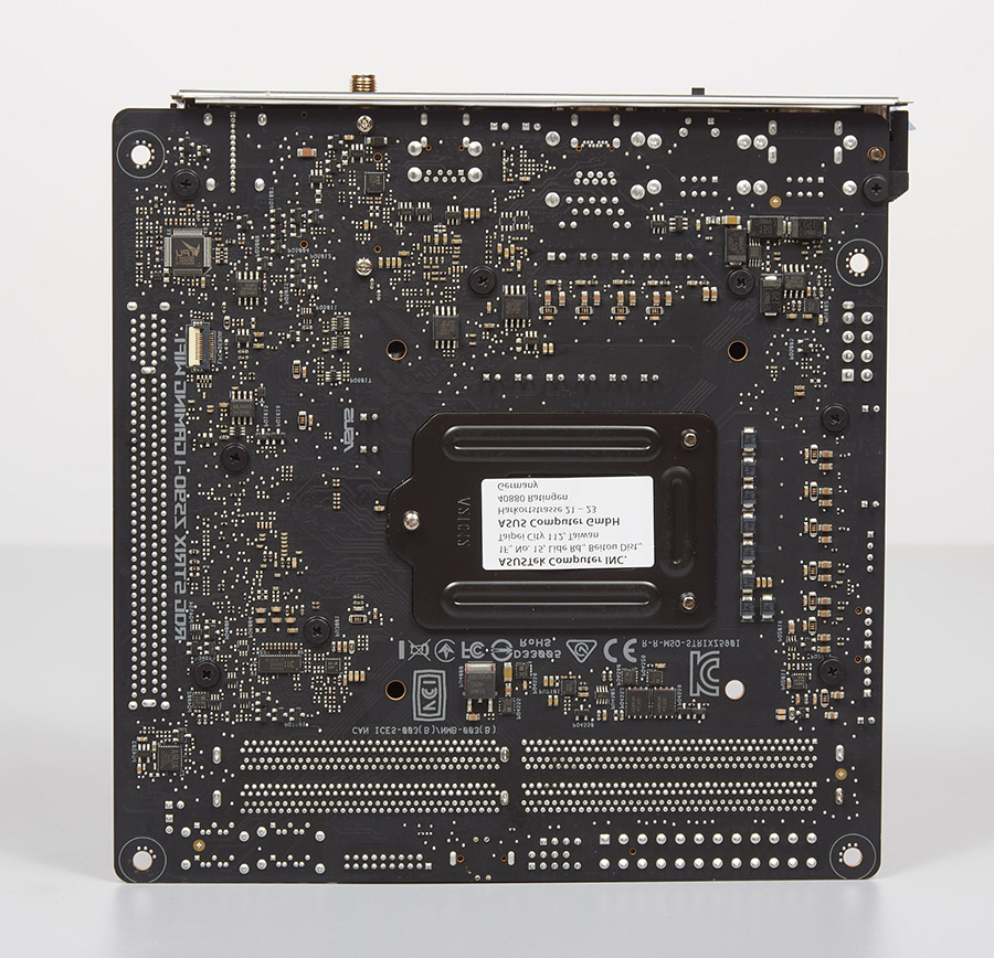 Количество элементов сзади тоже огромно. Следует проявить бдительность при подборе системы охлаждения, в особенности тут я хочу акцентировать внимание на задней пластине от неё. Места для литых металлических фактически и нет. С пластиковой рамкой от стендовой AIO, слегка возвышающейся над поверхностью, всё было нормально.