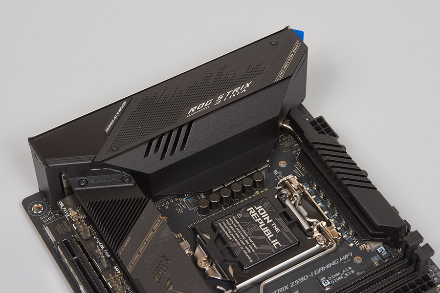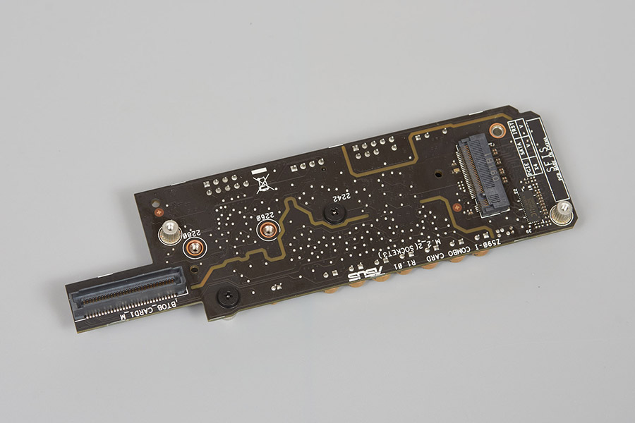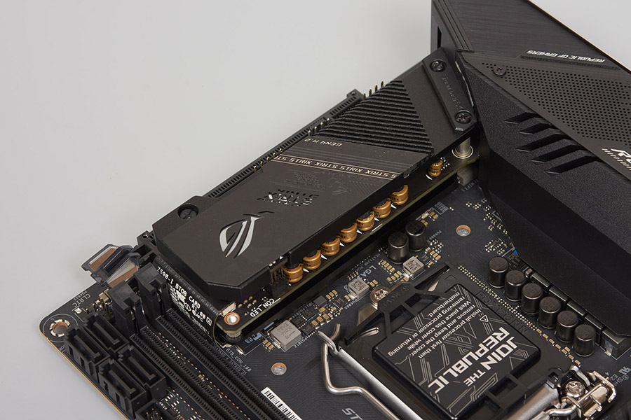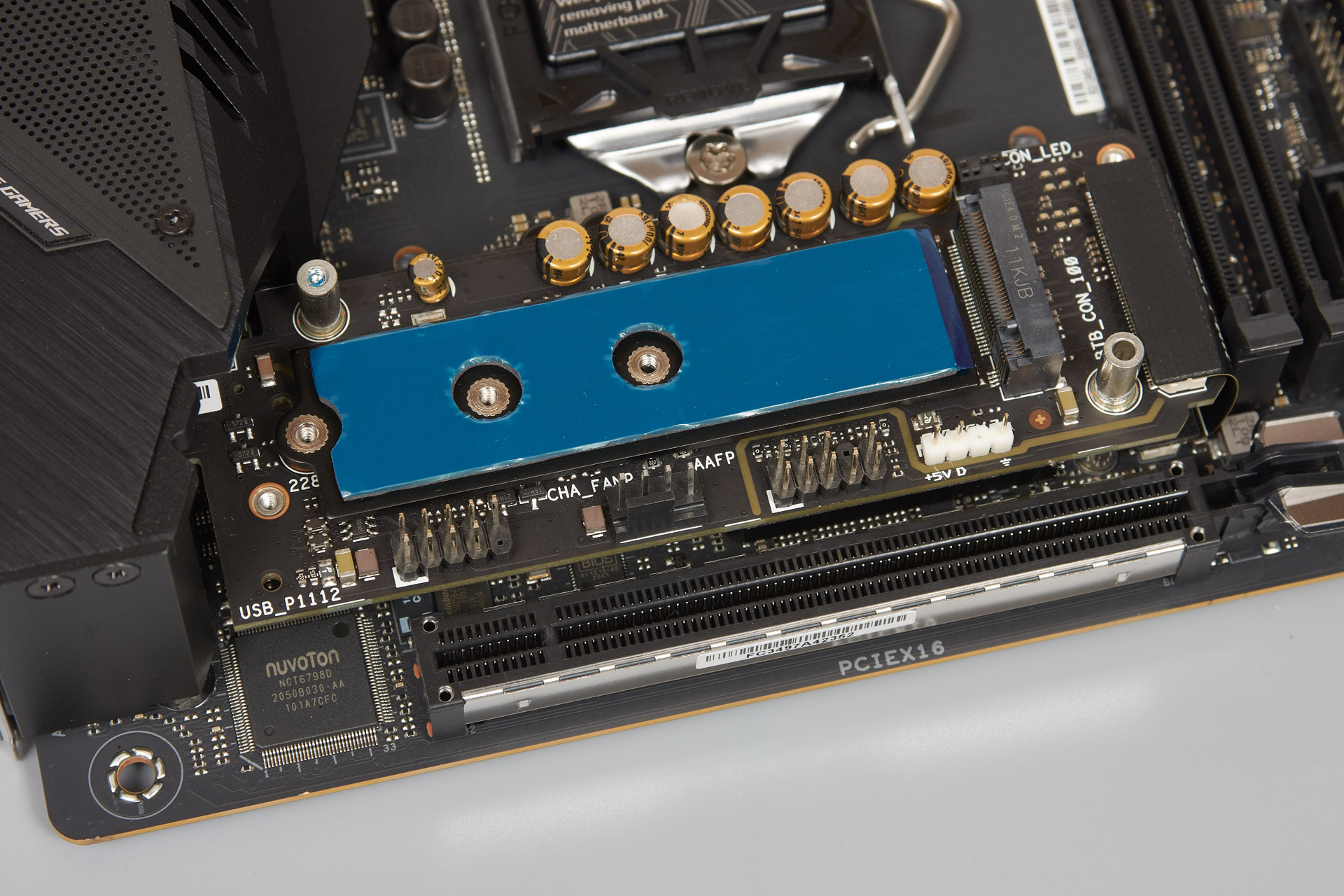Светящееся лого серии интегрировано в состав (верхнего) радиатора M.2, ещё на плате есть две разнотипных площадки для стороннего оборудования.