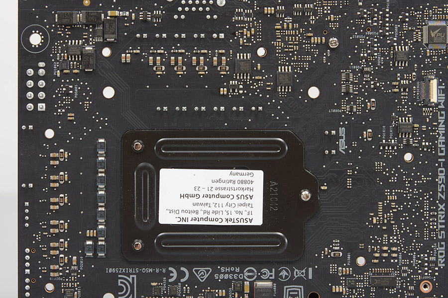 Плотность размещения элементов на плате запредельная. Рядом с чипом Z590 находится участок подсистемы питания процессора, а именно формирование напряжений IO и IO 2. Рядышком — танталовые конденсаторы. Уже на традиционных местах найдём одну сборку под SA Voltage, восемь — для CPU Voltage и ещё две — под нужды iGPU. В этот раз в ASUS не перемаркировали ШИМ-контроллер и мы видим Intersil ISL69269. Модели всех сборок ровно те же, что и в составе ASUS ROG Maximus XIII Hero, отличается лишь их число: три Texas Instruments 59880 и восемь Texas Instruments 95410RR. По всей видимости, речь идёт об истинных восьми «фазах» для CPU Voltage. Используется комбинация из твердотельных конденсаторов «военного» класса надёжности и большого числа танталовых, распаянных с обеих сторон платы.