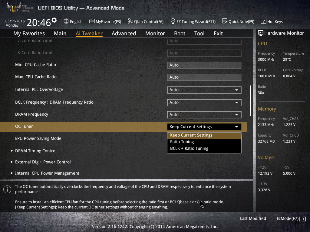 Здесь же включается функция OC Tuner, которая отвечает за автоматический разгон. Ее эффективность будет оценена во время испытаний ASUS Sabertooth X99 на прочность.