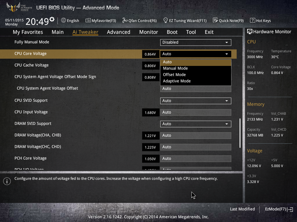 Для напряжений CPU Core Voltage и CPU Cache Voltage предусмотрено несколько режимов регулировки: Manual Mode, при котором требуемое значение задается в явном виде, Offset Mode, дающий возможность определить прирост к штатной величине, а также Adaptive Mode, сочетающий возможности двух предыдущих методов.