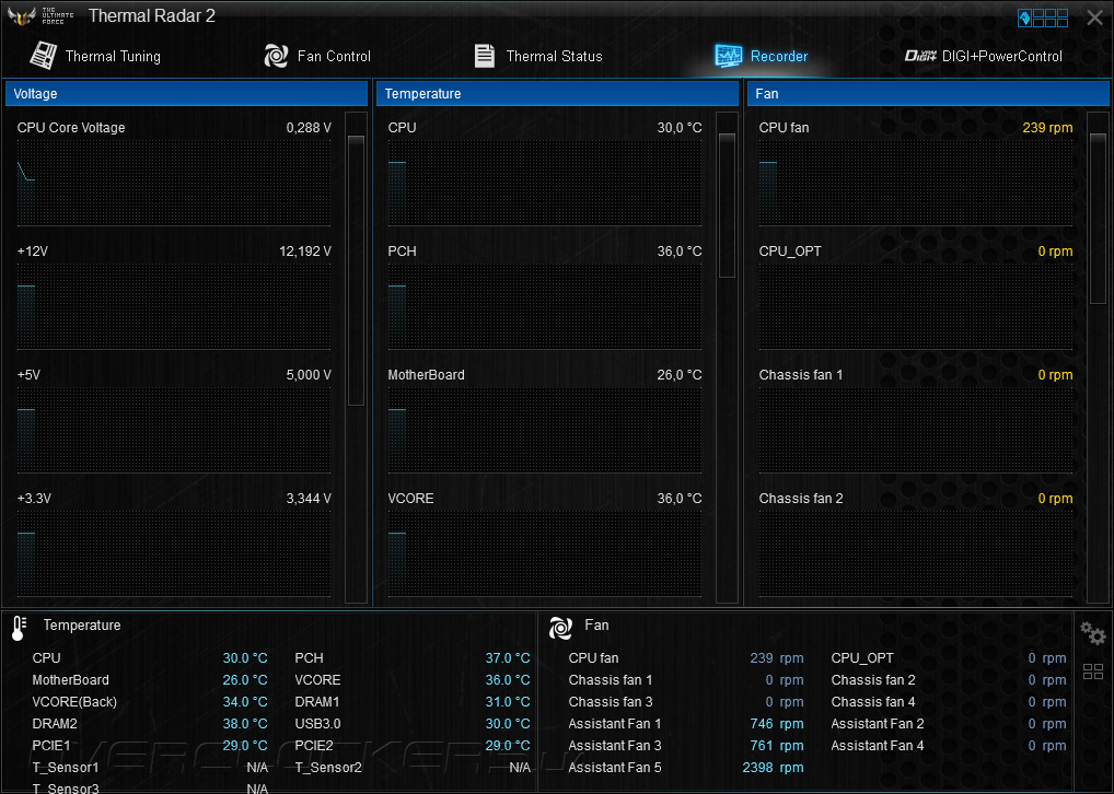 Thermal Radar 2 оснащена подпрограммой Recorder для отображения динамики изменения параметров аппаратного мониторинга, а также функцией Digi+ Power Control, которая служит для управления тонкими настройками цифровых преобразователей напряжения, такими как частота переключения силовых элементов или функция Load-line Calibration.