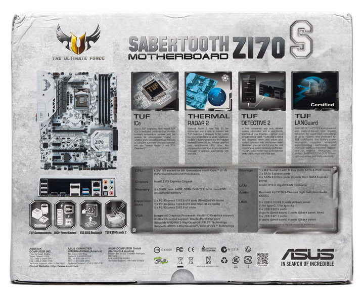 Все детали находятся на обратной стороне коробки. Есть фото платы и её задней панели, таблица с характеристиками. Отдельного внимания удостоен фирменный программный продукт — Thermal Radar 2, также написали и про TUF Detective.