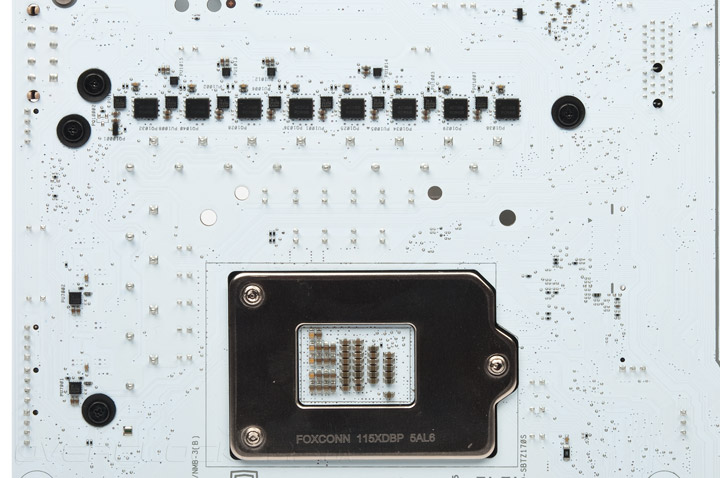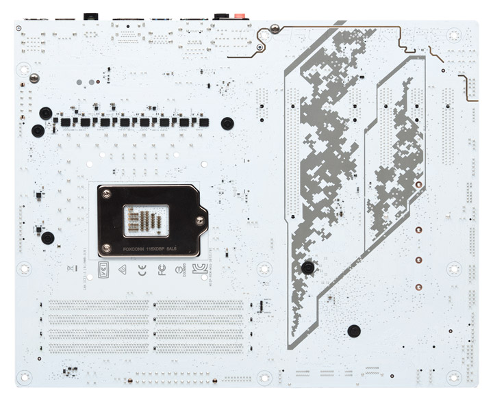 Сзади видны лишь шляпки винтов, закрепляющих охлаждающие конструкции и пара саморезов для колпака над задней панелью. Россыпи светодиодов, привычных для большинства серьёзных и не очень плат, тоже нет.