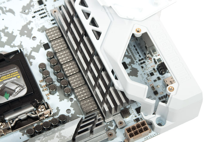 «Святящимся» является радиатор PCH. Здесь распаяно пять ярких светодиодов белого цвета. Это индикатор питания и комплекс Q-LED из четырёх штук. Часть из них неудобно перекрывается габаритной видеокартой. Сам охладитель массивный и с лёгкостью справляется с возложенными обязанностями. Подсветку можно отключить в UEFI.