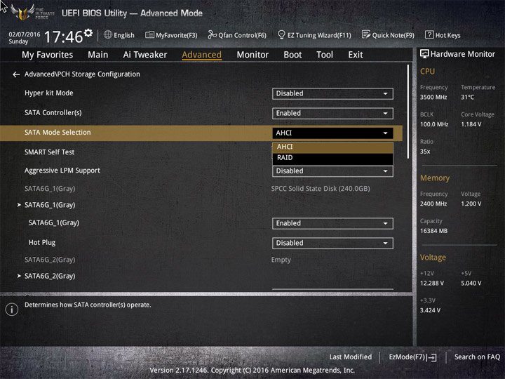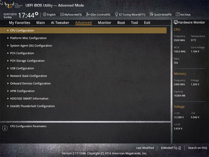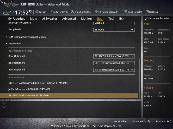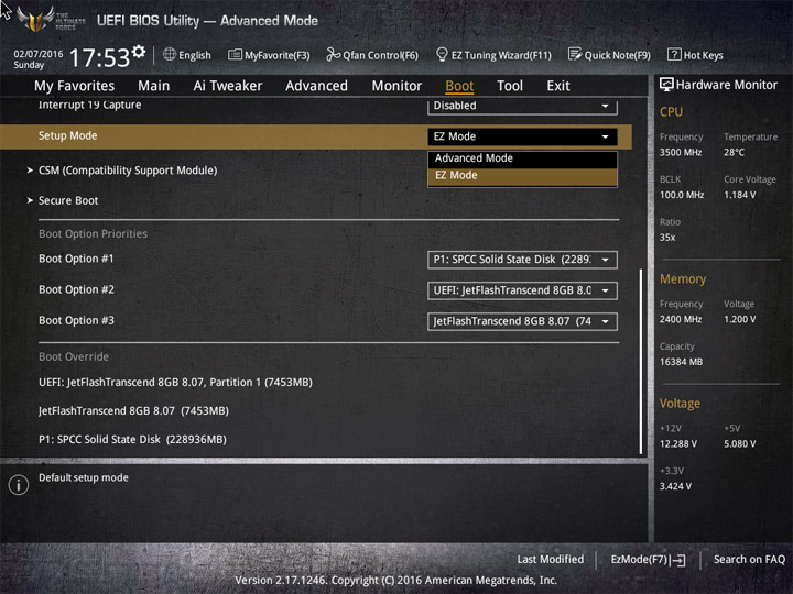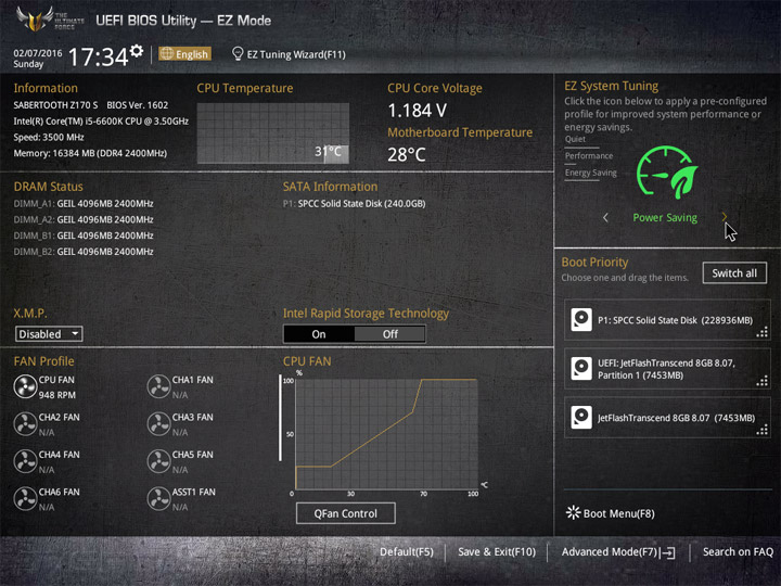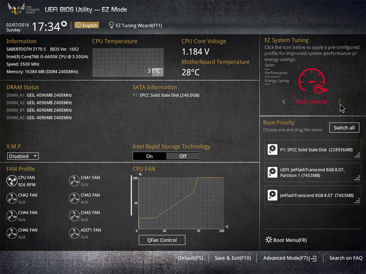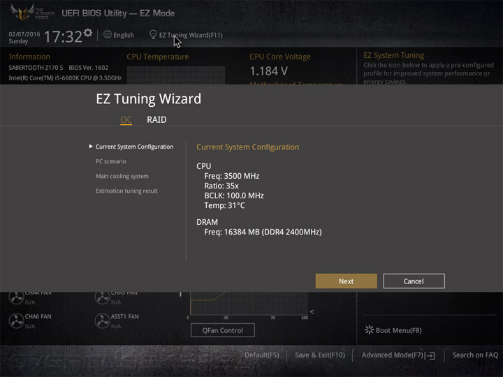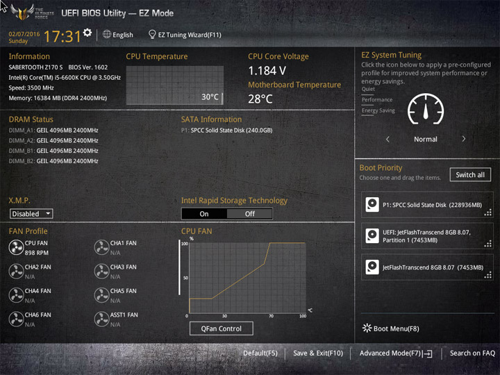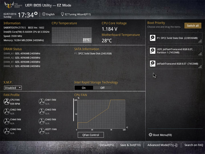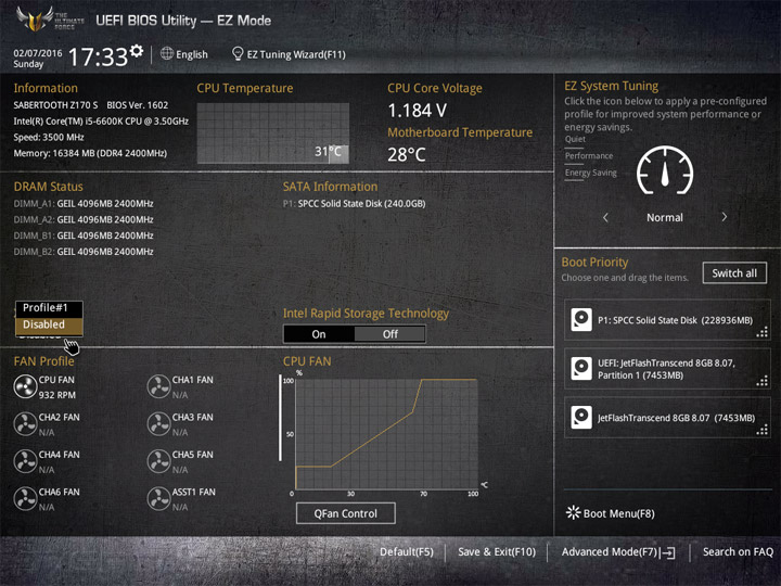 Первый режим работы с настройками UEFI приготовлен для широкой аудитории пользователей. Здесь видна некоторая информация о системных компонентах и режимы работы системы. Для изменения доступны базовые вещи: дата и время, локализация интерфейса, активация XMP, несколько готовых профилей для большого числа системных охладителей. Отдельное меню у мастера по разгону системы и формированию конфигураций RAID, именуемое EZ Tuning Wizard. В случае наличия большого числа накопителей не лишним будет увеличение области отображения Boot Menu.