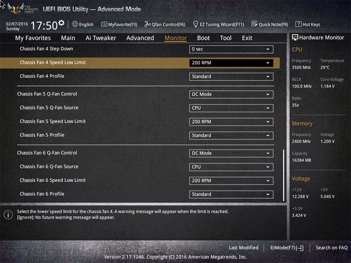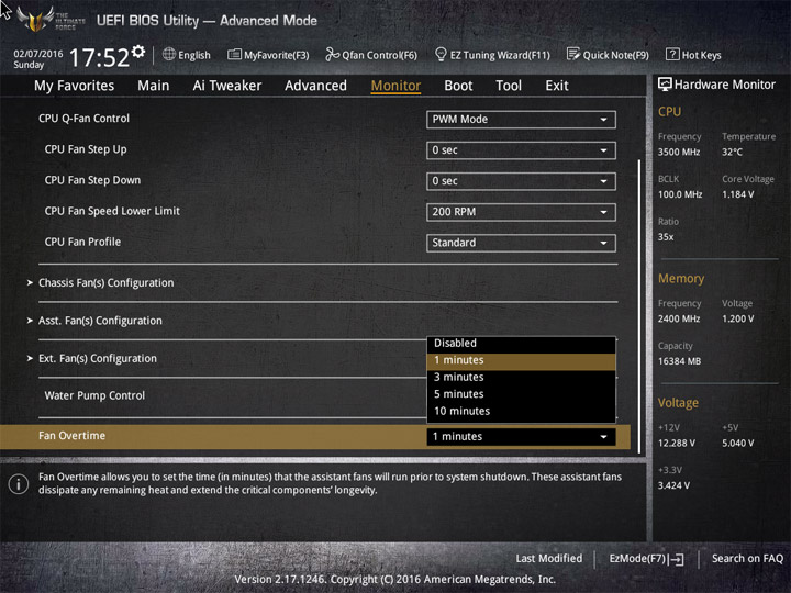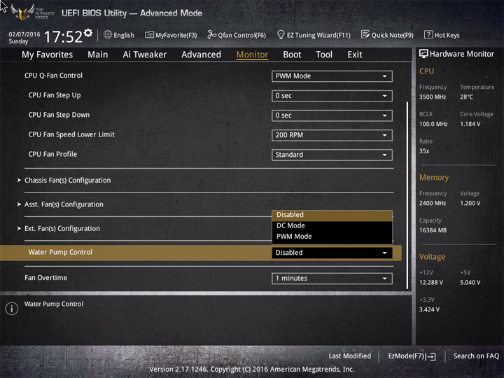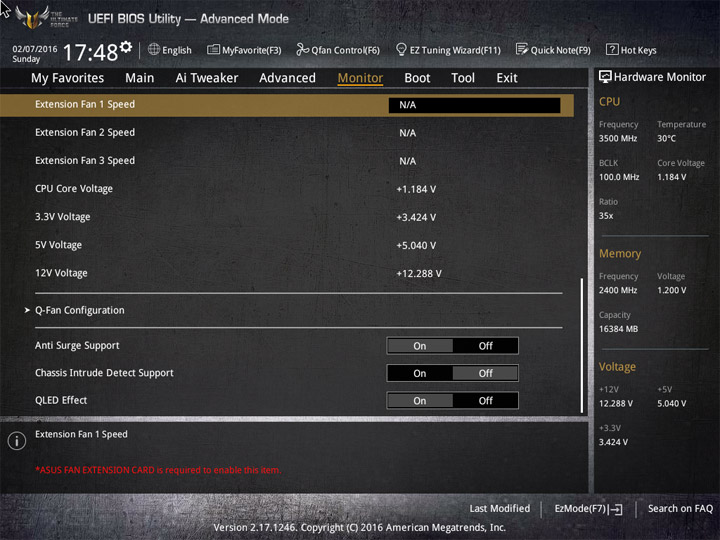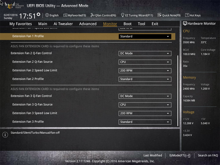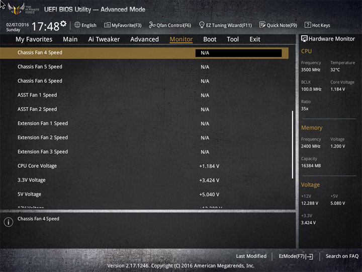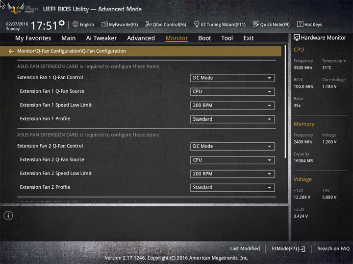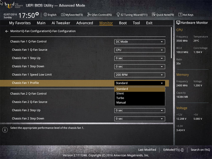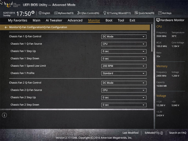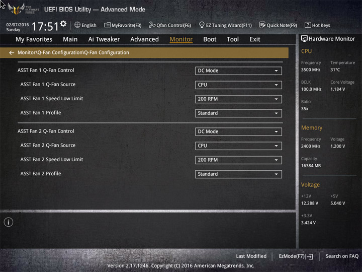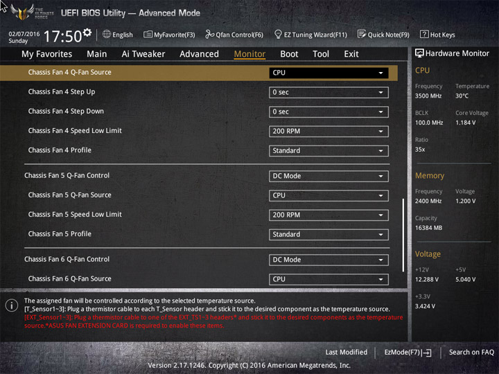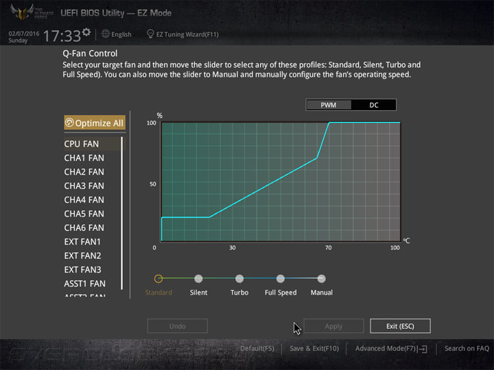 Насыщение изделия колодками для вентиляторов весьма обильное, но всего их можно использовать на одну штуку меньше относительно ASUS Sabertooth Z170 Mark 1. Набор возможностей остался таким же. Есть столько же интегрированных на PCB температурных датчиков (вместе с температурой процессора — десять). Ещё три термопары могут быть подключены к предусмотренным для того штырьковым гнёздам. В качестве способа изменения скорости вращения вентиляторов можно выбирать между напряжением (DC) и скважностью ШИМ (PWM) для любого изделия, в том числе — процессорного охладителя. Есть три готовых профиля для любого канала и возможность использовать собственные настройки в режиме Manual. Кроме того, для системных изделий роль опорной температуры для установленного алгоритма может играть любой из действующих датчиков.