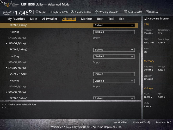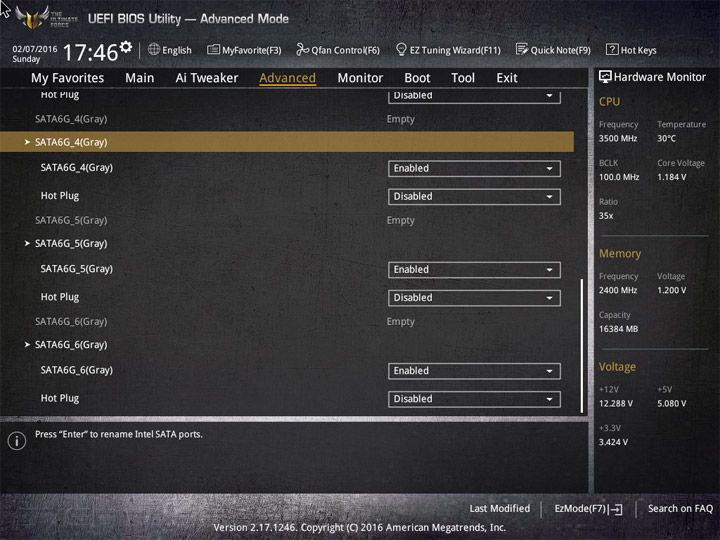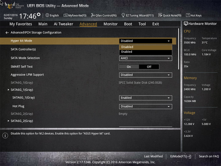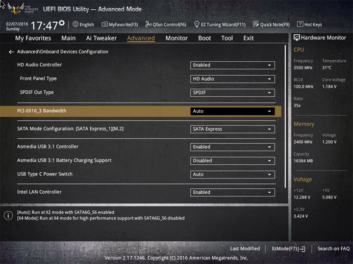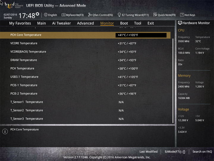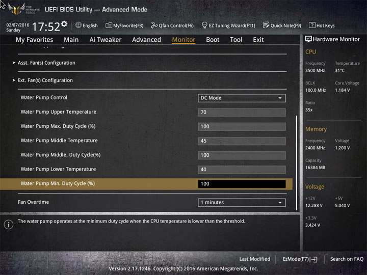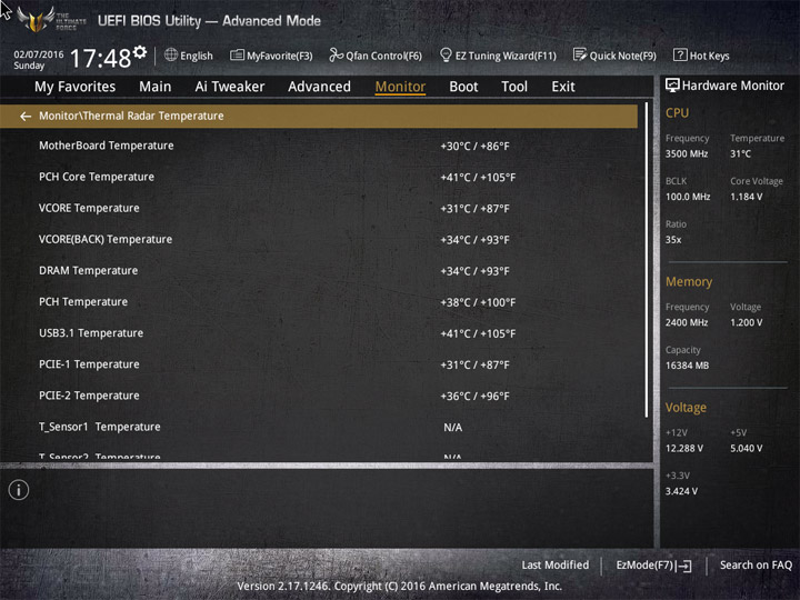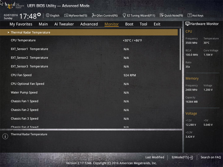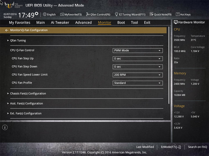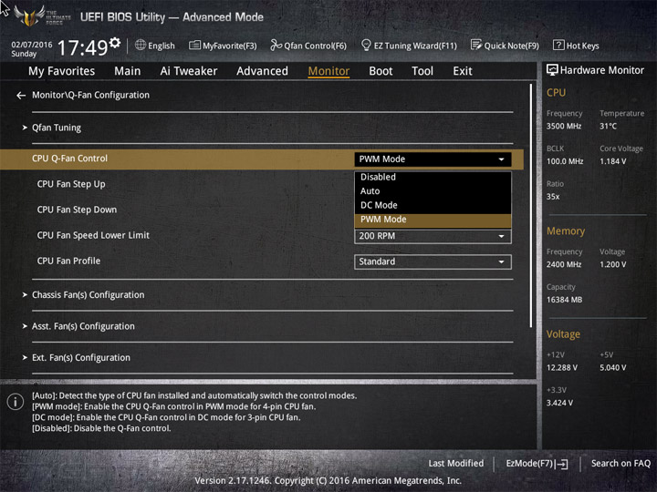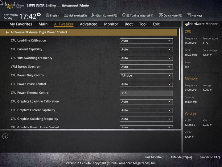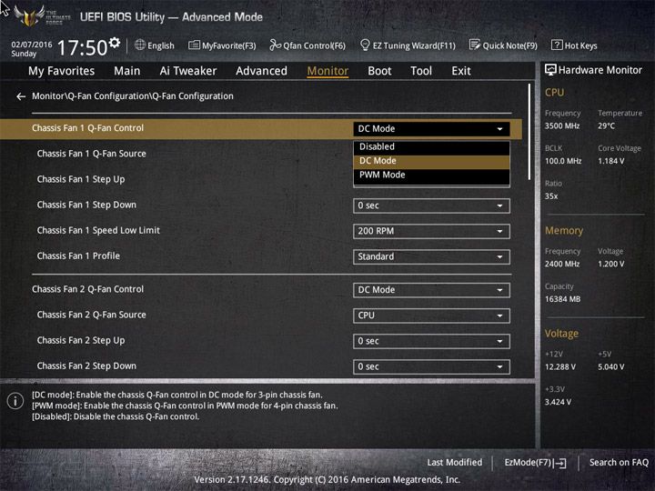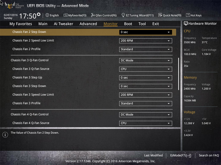 Насыщение изделия колодками для вентиляторов весьма обильное, но всего их можно использовать на одну штуку меньше относительно ASUS Sabertooth Z170 Mark 1. Набор возможностей остался таким же. Есть столько же интегрированных на PCB температурных датчиков (вместе с температурой процессора — десять). Ещё три термопары могут быть подключены к предусмотренным для того штырьковым гнёздам. В качестве способа изменения скорости вращения вентиляторов можно выбирать между напряжением (DC) и скважностью ШИМ (PWM) для любого изделия, в том числе — процессорного охладителя. Есть три готовых профиля для любого канала и возможность использовать собственные настройки в режиме Manual. Кроме того, для системных изделий роль опорной температуры для установленного алгоритма может играть любой из действующих датчиков.