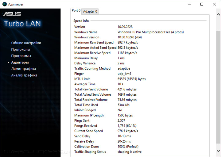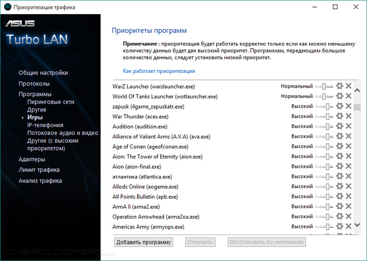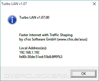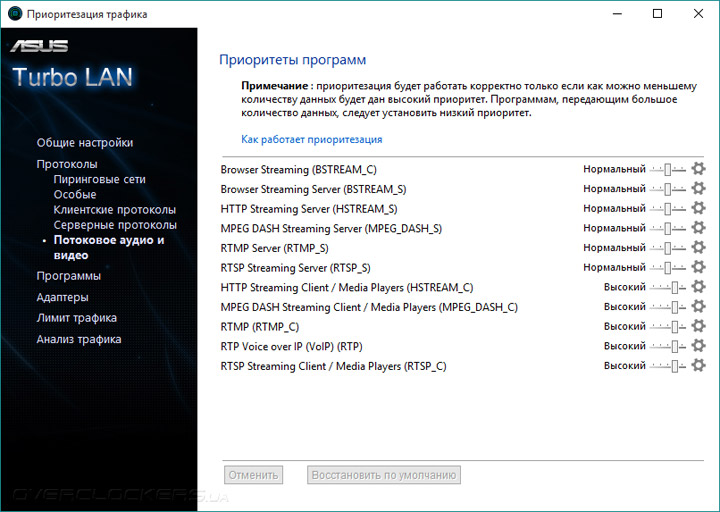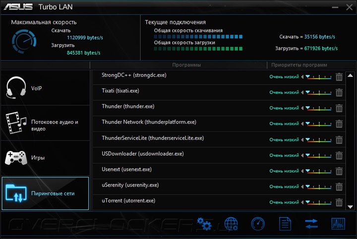 Более подробно о фирменном ПО можно почитать в обзоре ASUS Sabertooth Z170 Mark 1. В этот раз сборка Turbo LAN оказалась работоспособной, а потому лишний раз можно убедиться в её истинном родстве с утилитой cFosSpeed. Она имеет множество преднастроек, пользователю достаточно выбирать лишь сценарий функционирования системы — максимальная скорость либо же минимальное время ответа системы («пинг»).