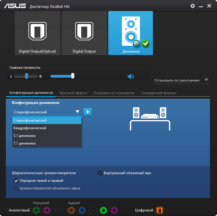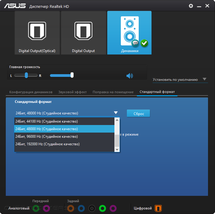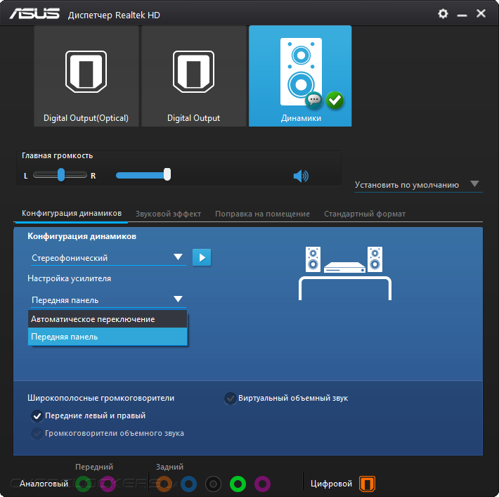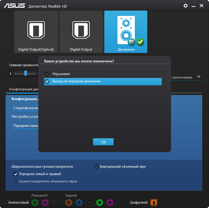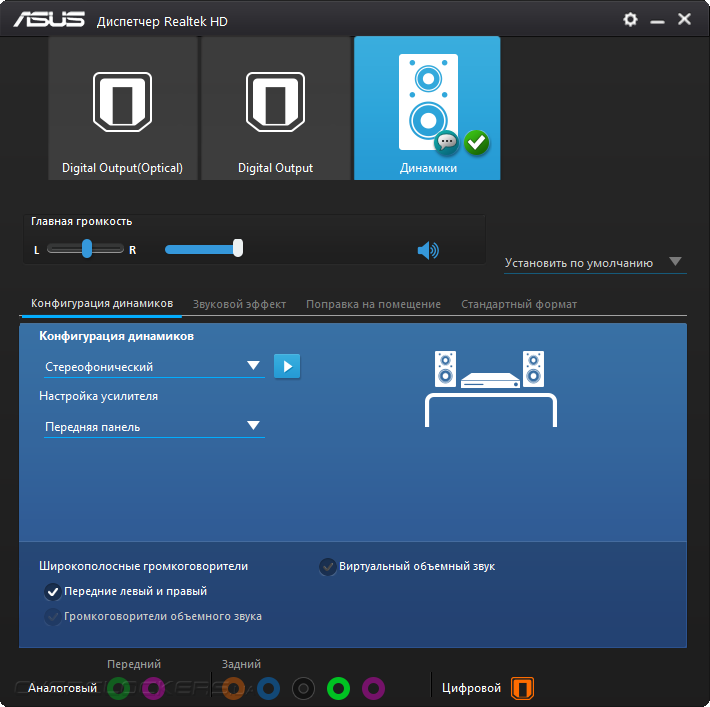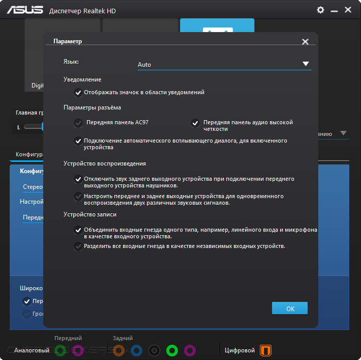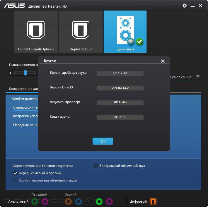Звуковая составляющая сопровождается поддержкой, выраженной в фирменном конфигураторе от Realtek. Там можно настроить лишь работу ОУ, то есть направить его использование на нужды передней панели ПК или же задней самой платы. Это даёт незначительное изменение в картине звучания.