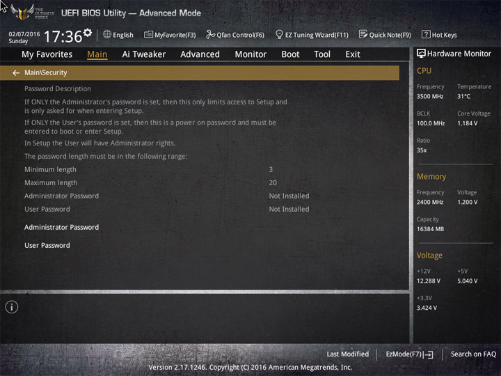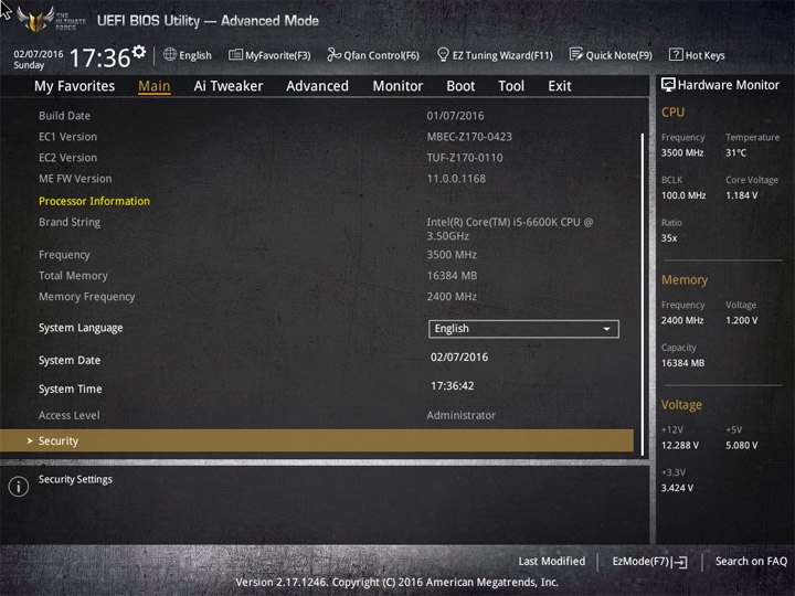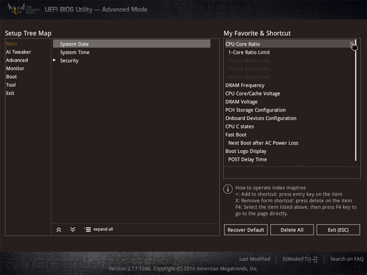 Полный спектр настроек находится в Advanced Mode. Первая глава — My Favorites, будет полезна тем, кто регулярно что-нибудь настраивает. Её содержимое можно редактировать. Следующий раздел Main покажет больше сведений об программной оснастке материнской платы. Ещё здесь есть механизм по ограничению доступа к системе.
