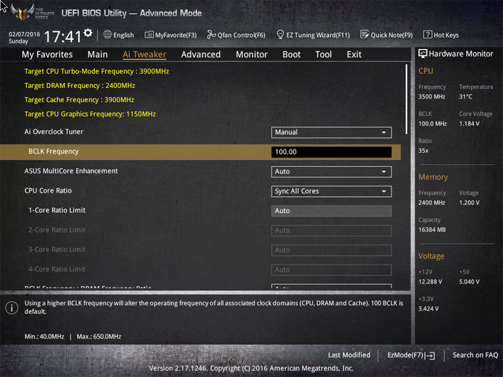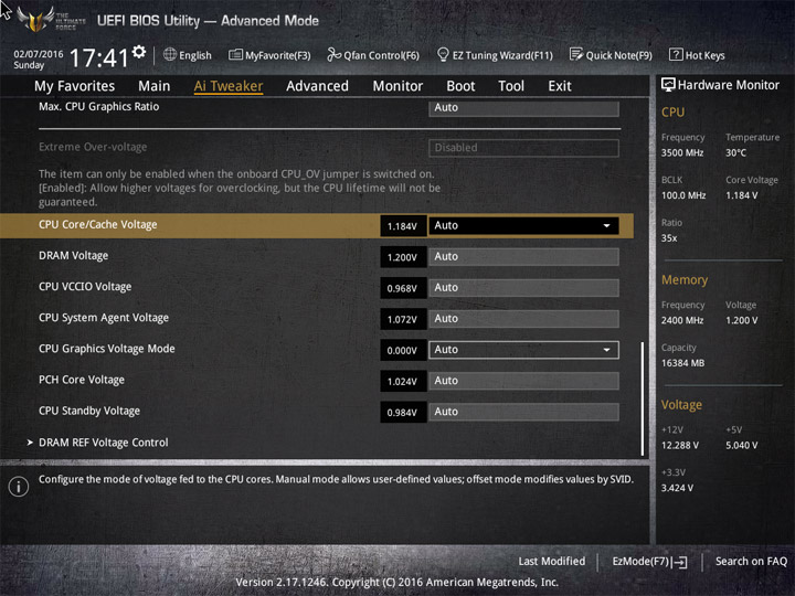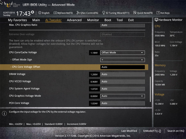| CPU Core Voltage Override (В) | 0,6–1,7 | 0,005 |