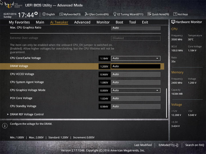 | DRAM Voltage (B) | 1,0–2,0 | 0,005 |