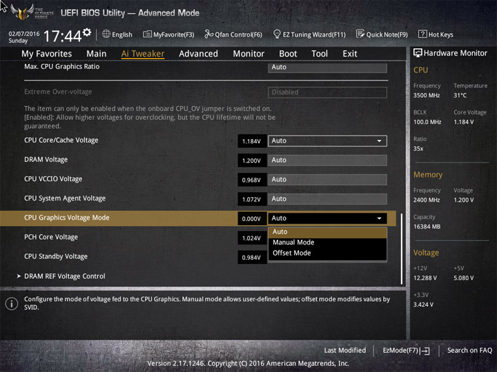 | CPU Graphics Voltage Override (В) | 0,6–1,7 | 0,005 |