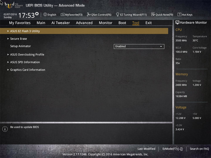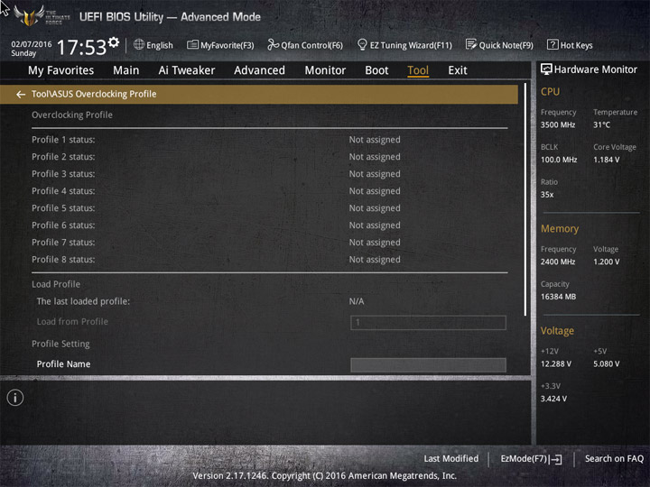 У моделей серии TUF меньше дополнительных инструментов, чем у родственных представительниц из семейства ROG. Наиболее, на мой взгляд, востребованный пункт меню — Overclocking Profile. Здесь можно сохранить восемь состояний системы.