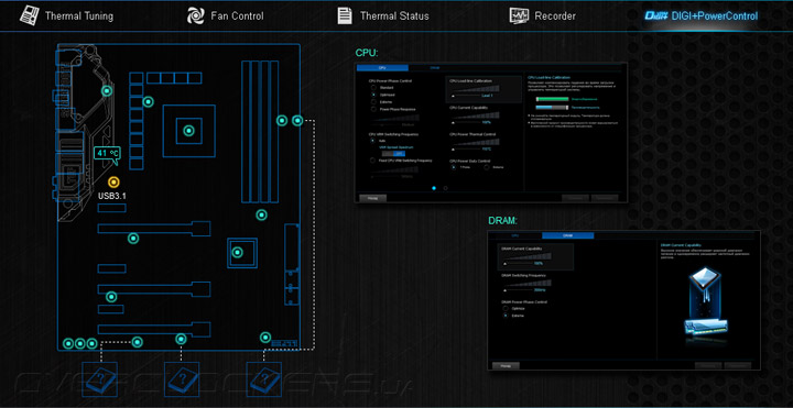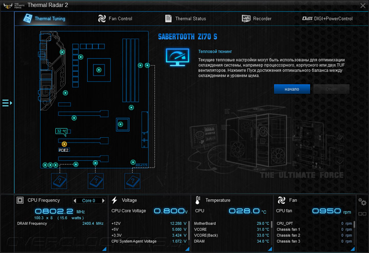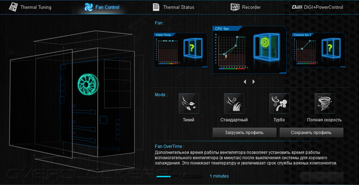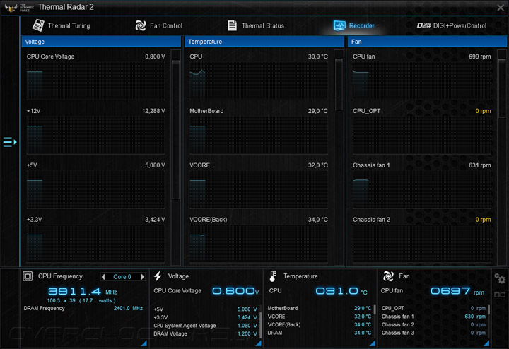 Четвёртая вкладка — Recorder, пока ещё никак не видоизменённый. Информативности при работе с ним маловато, да и периодичность снятия свежих показателей не регулируется. Настройки подсистем питания видны в разделе DIGI+PowerControl.