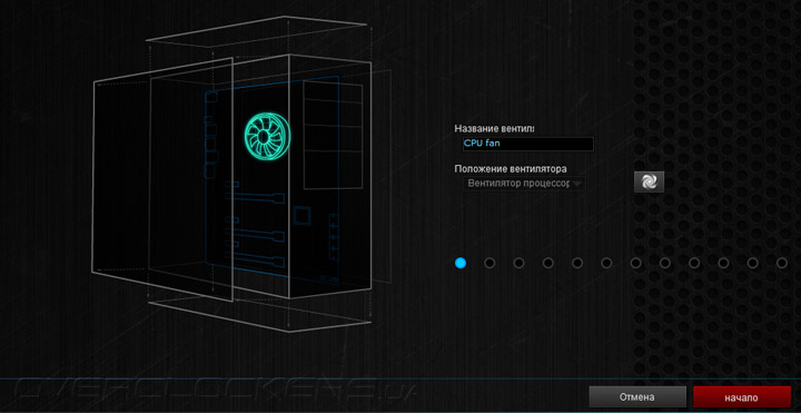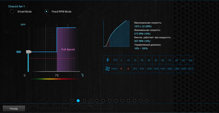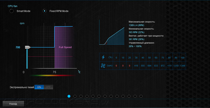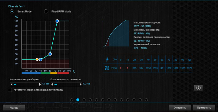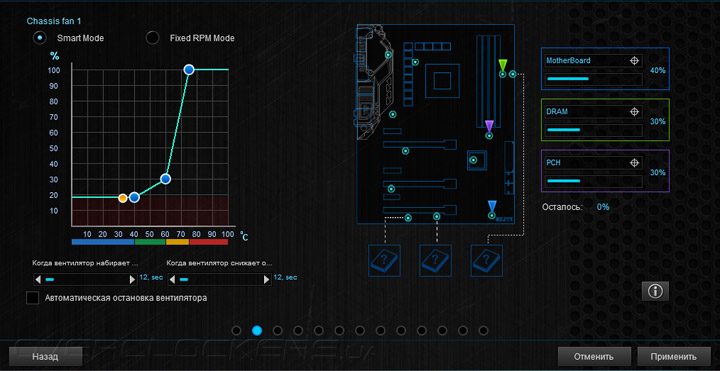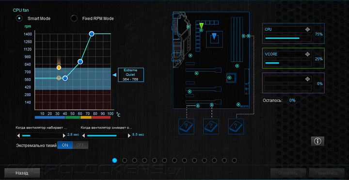 Практически все действия здесь нацелены на обеспечение взаимодействия системных охладителей и платы. Вначале проводится калибровка изделий. Затем можно приступать к подбору алгоритма работы каждого вентилятора. Выбирать придётся между интеллектуальным режимом функционирования Smart Mode, где роль опорной температуры будет отдана на откуп уже трём датчикам (на выбор пользователя), причём можно изменять участие каждого в процентном соотношении. Также можно предпочесть фиксированные обороты, но лишь до тех пор, пока процессор не прогреется до 75 °C. Проверить эффективность настройки можно здесь же, воспользовавшись страницей Thermal Status.