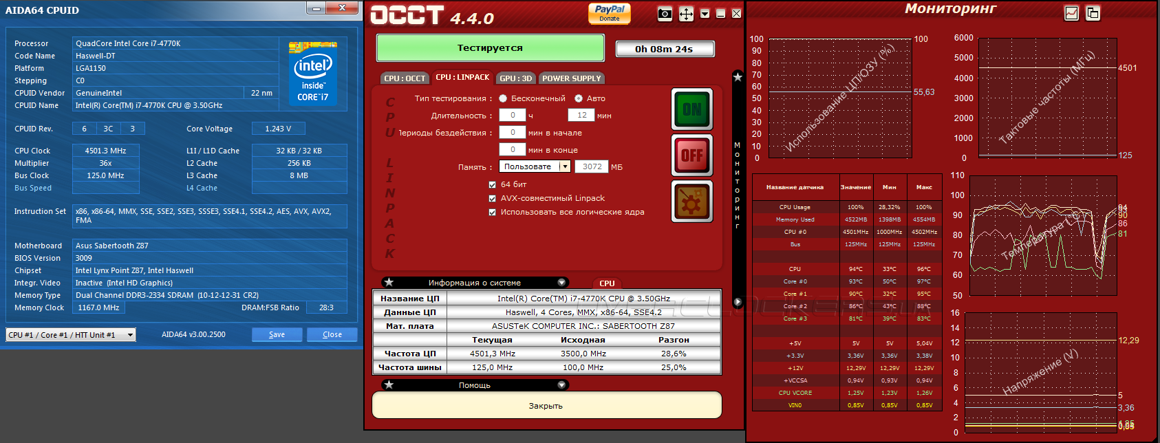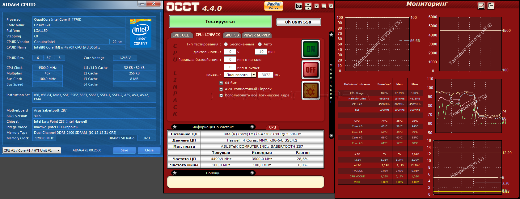 Наш опыт по оверклокингу Intel Haswell пока невелик, но уже можно сказать, что при разгоне эти процессоры чрезвычайно требовательны к эффективности системы охлаждения. Из двух Core i7-4770K, побывавших в нашей тестовой лаборатории, первый показал результат в 4600 МГц при напряжении 1,224 В, тогда как достижения второго экземпляра несколько скромнее — 4500 МГц при величине Vcore, равной 1,24 В. В обоих случаях максимальная температура приближалась к 100 °С несмотря на использование одного из лучших воздушных кулеров Thermalright Silver Arrow. Увы, для оценки запаса прочности ASUS Sabertooth Z87 нам пришлось использовать менее удачный процессор, для которого удалось добиться стабильной частоты 4500 МГц при напряжении на вычислительных ядрах 1,243 В.
