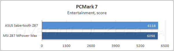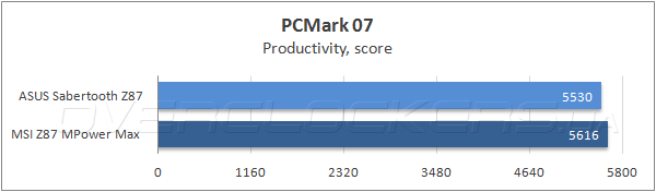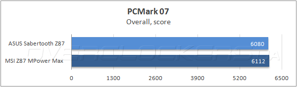 Интегральный балл в специализированной тестовой программе Futuremark PCMark 7 соперниц практически совпал, тогда как в половине из тестовых сценариев модель ASUS немного опередила оппонентку, а в двух оставшихся подтестах победила MSI Z87 MPower Max.
