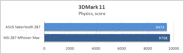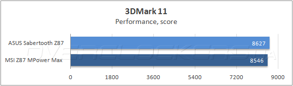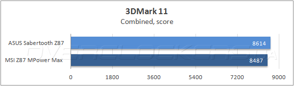 Победу Sabertooth Z87 в графическом бенчмарке Futuremark 3DMark 11 можно было бы назвать безоговорочной, если бы не результаты теста Physics, в котором новинка уступила системной плате MSI.