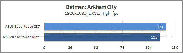 В современных видеоиграх обе системные платы показывают почти одинаковую частоту смены кадров за исключением шутера Batman: Arkham City, где продукт ASUS заметно опередил своего визави.